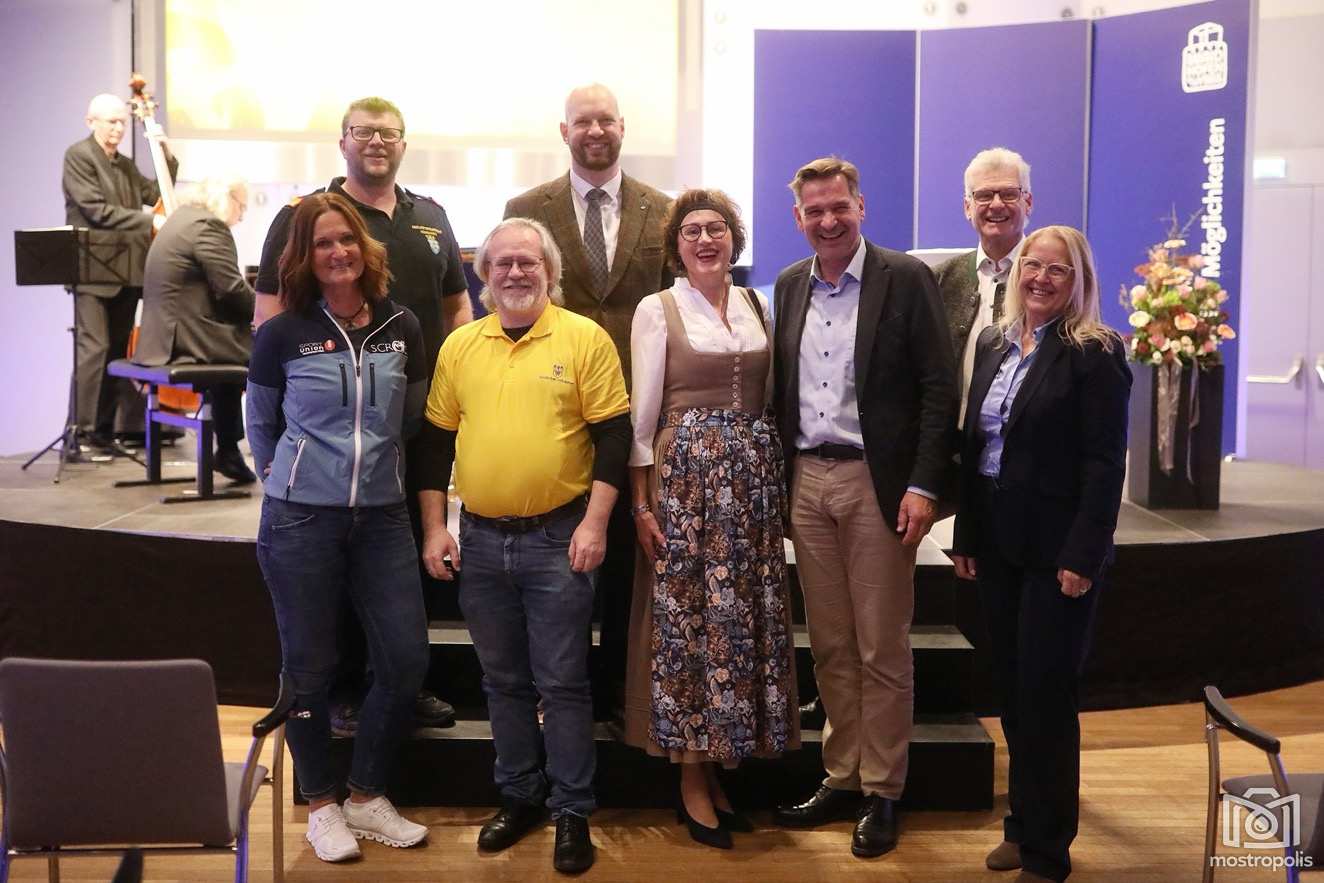 Foto (z.V.g.), v.l.n.r.: Bettina Buder (Sportunion Sektion Leichtathletik), Michael Höritzauer (Freiwillige Feuerwehr), Thomas Krall (Waidhofner Volksbühne), Vizebürgermeister Armin Bahr, Dorothea Hintsteiner (Goldhauben- und Trachtenverein), Bürgermeister Werner Krammer, Stadtrat Erich Leonhartsberger u. Maria Fuchs-Semmelweis (Obfrau Freiwilligenbörse)