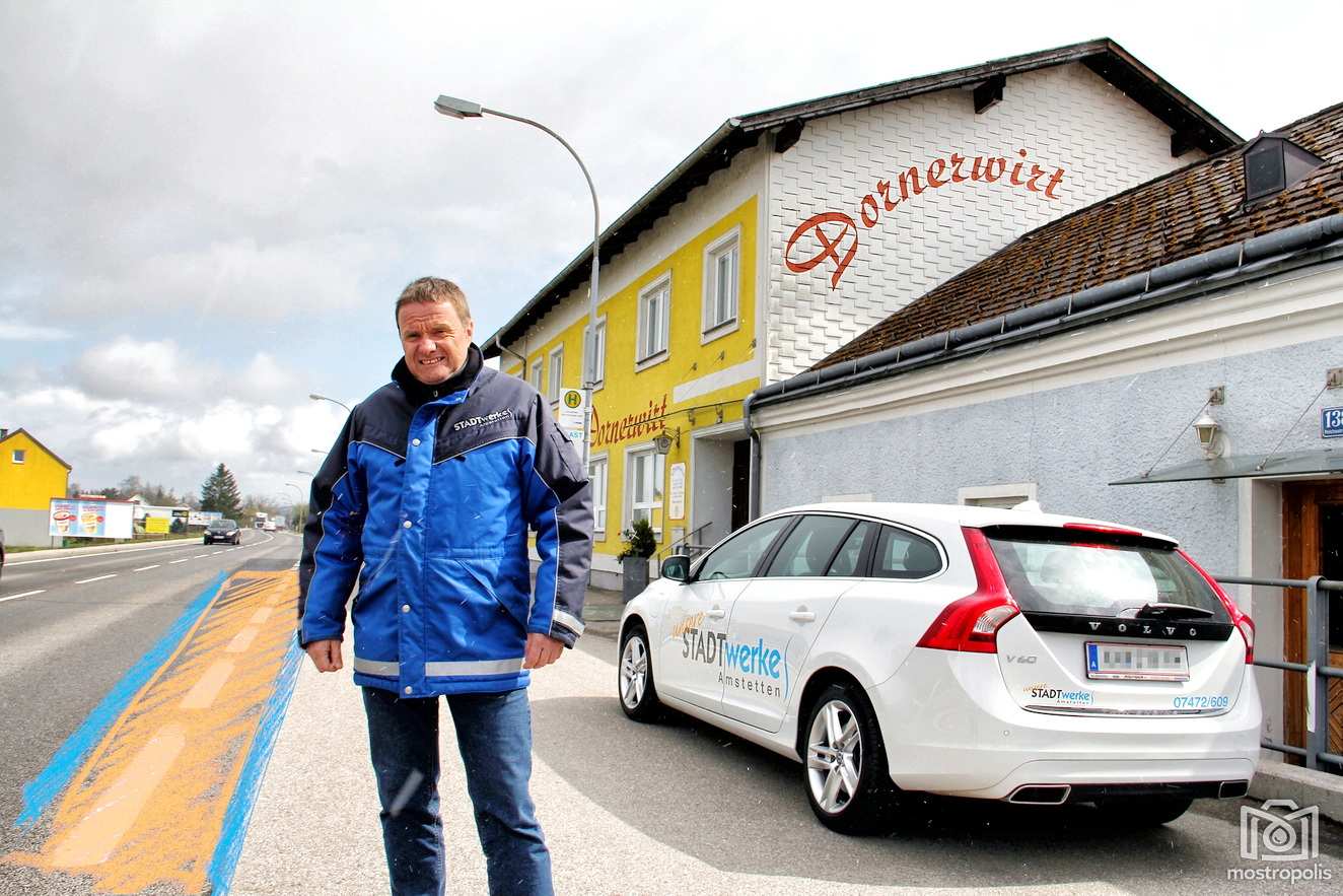 Foto (c) STADTwerke: Wassermeister Wolfgang Hackl informiert über die Grabungsarbeiten lt. oranger Markierung.