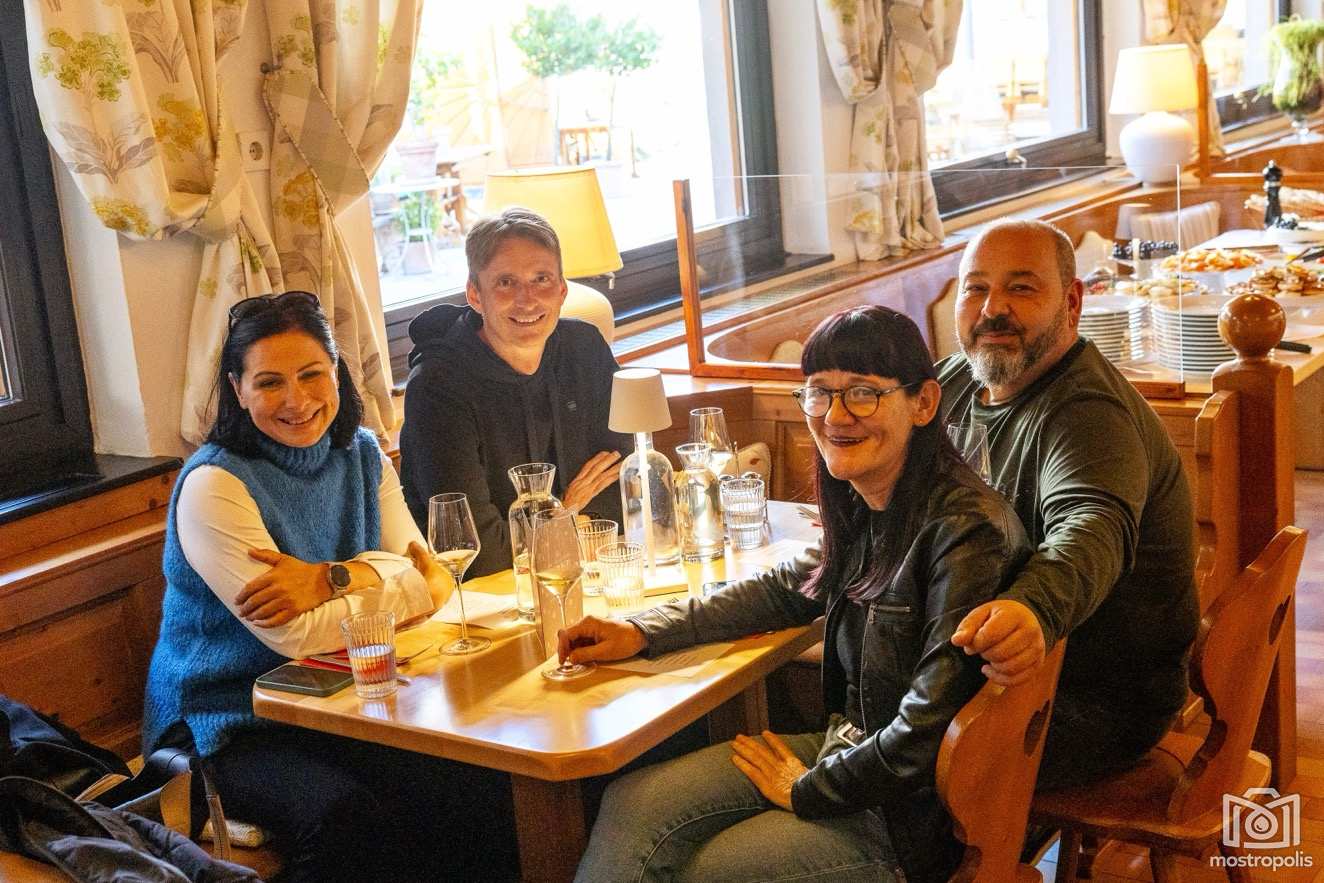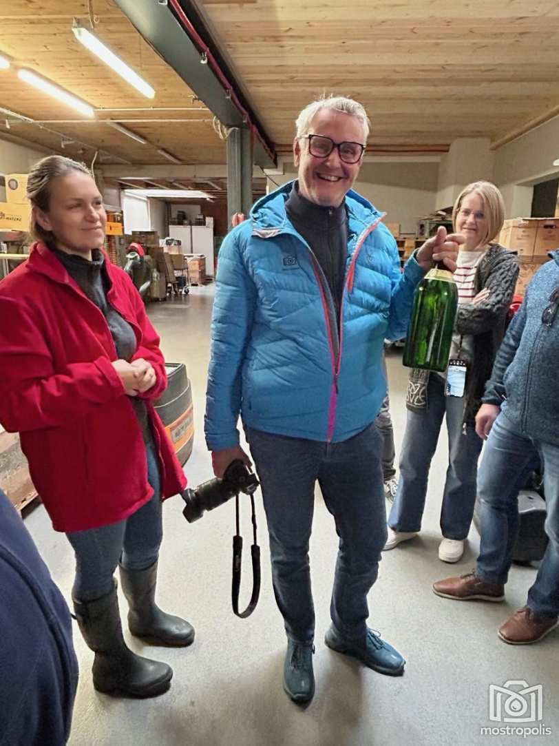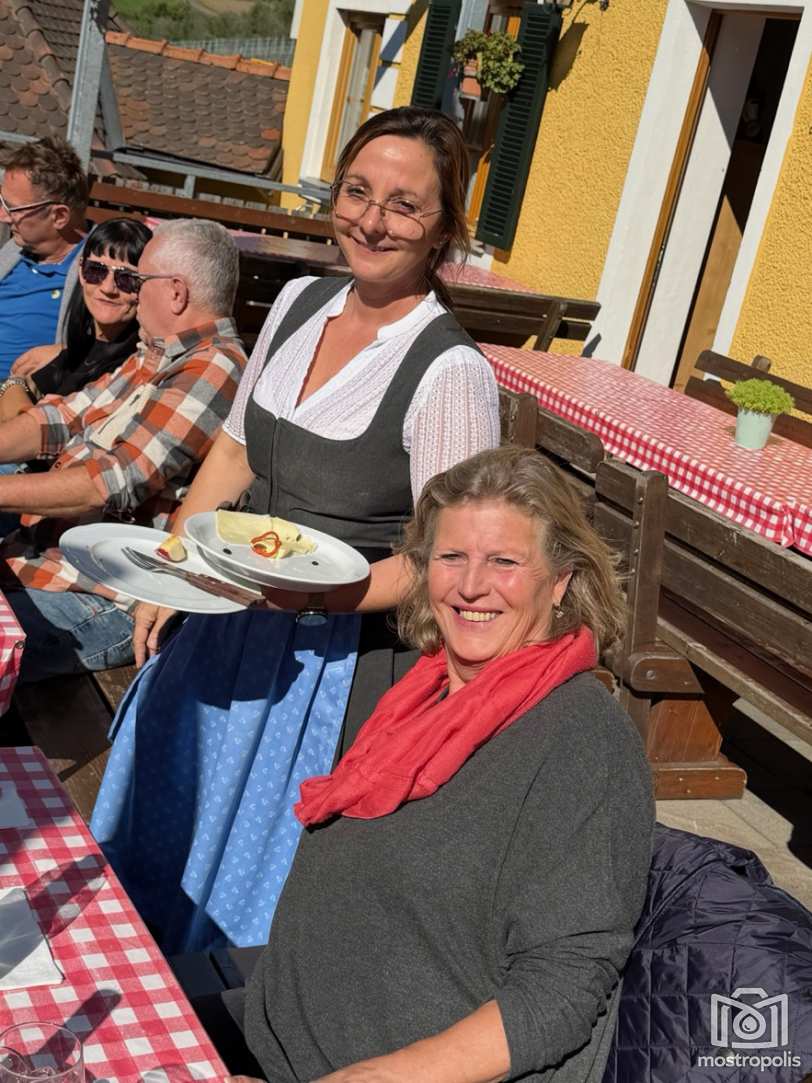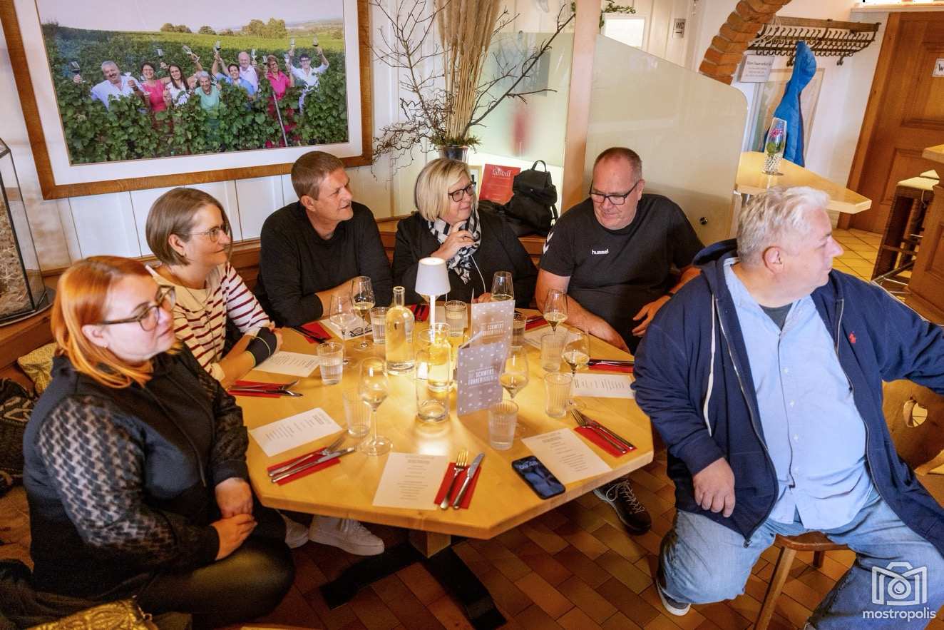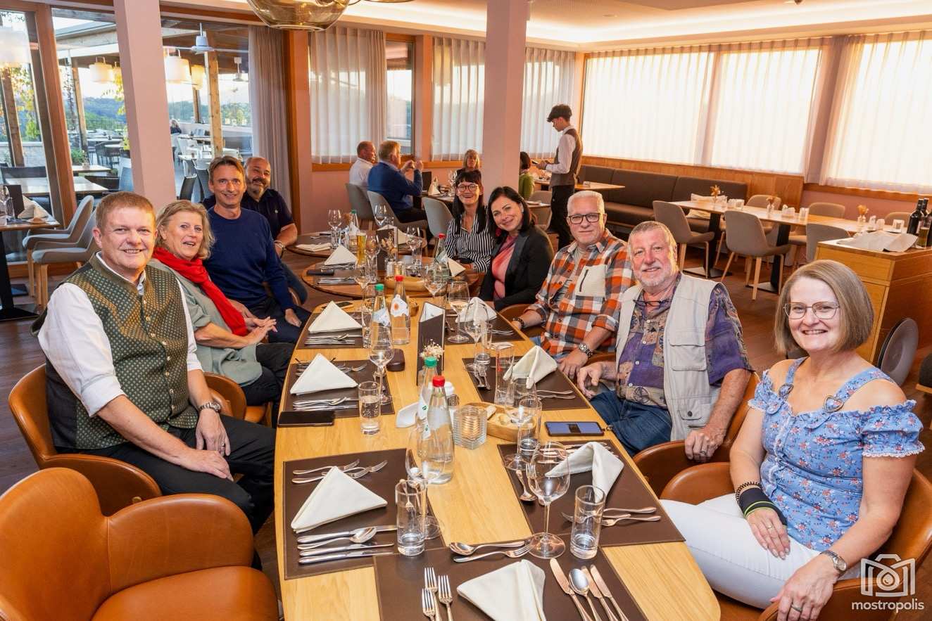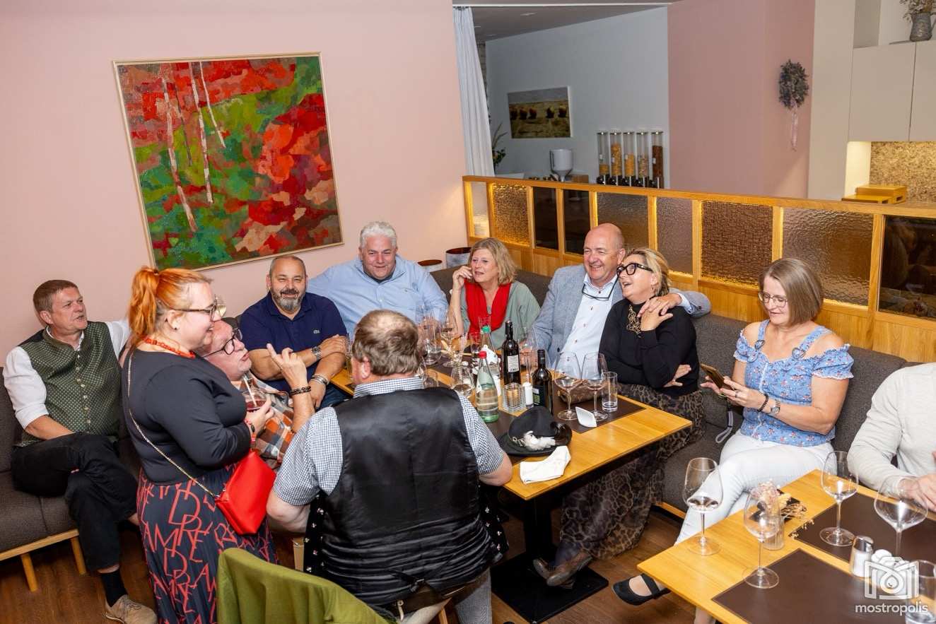 Perfekt organisiert von Jutta Koczirz ging es mit leichten Startschwierigkeiten zum Winzerfrühstück und Weinverkostung bei den Schwertführerinnen in Sooss, wo uns Kellermeisterin Kerstin und Heurigenchefin Sigrid das Weingut bzw. die Produktion sowie den Heurigen vorstellten. Bescheiden im Hintergrund Christine und Johann Schwertführer, die nach wie vor ihren beiden Töchtern nicht nur mit Rat, sondern immer noch mit Tat zur Seite stehen. Im Anschluss ging es weiter nach Riegersburg, wo uns Silvia Bernhart vom gleichnamigen Weingut mit Buschenschank mit einer üppigen Winzerjause samt Weinverkostung bereits erwartete. Gestärkt und gut gelaunt checkte dann die illustre Runde im wunderschönen Genusshotel Riegersburg ein. Die freie Zeit nutzten einige zum Spazieren, Kuscheln, Weitertrinken oder Wellnessen. Am Abend gab es dann ein 5-gängiges Menü mit Weinbegleitung, bestens kommentiert von Sommelier Lukas Fleck. Beeindruckt hat sie alle auch das Kennenlernen von Edi, dem singenden Baggerfahrer auf Feldkirchen bei Mattighofen, der mit seinen Gesangseinlagen alle begeisterte. Hier gibt's ein kleines VIDEO dazu! Mit launigem Fachsimpeln bis nach Mitternacht fand der erste Tag einen gemütlichen Ausklang.