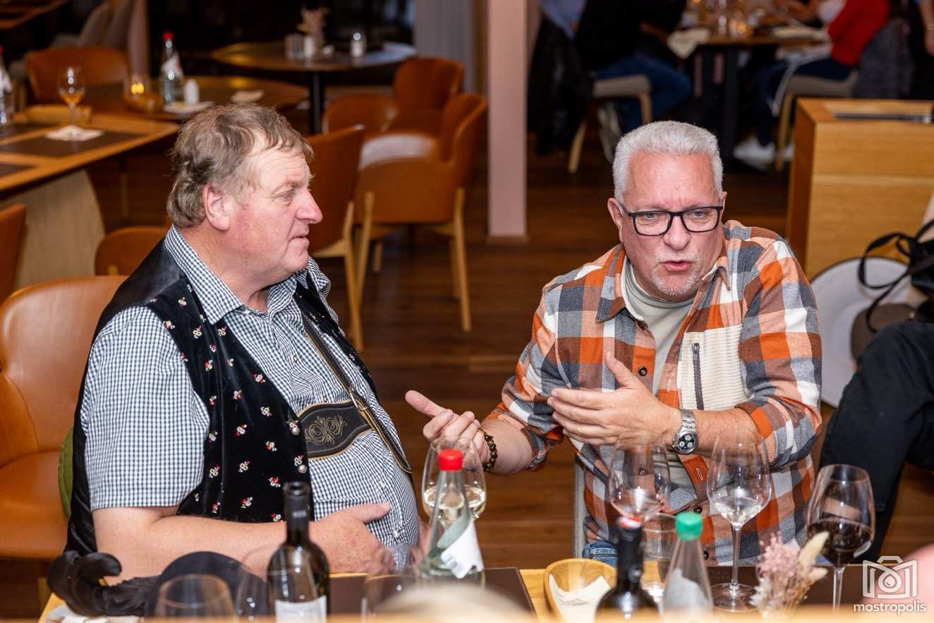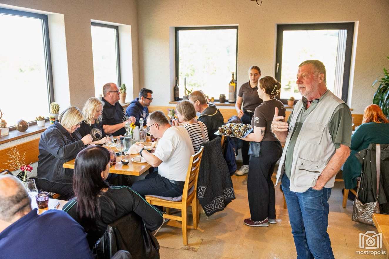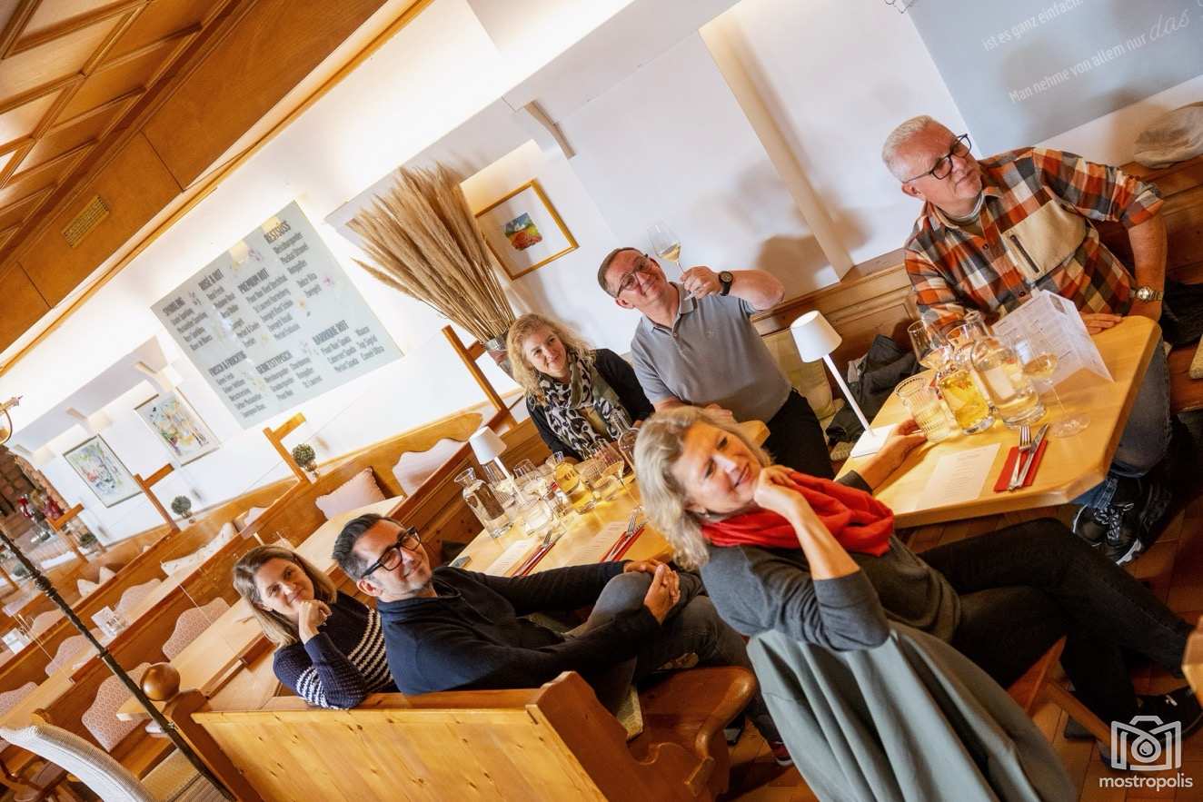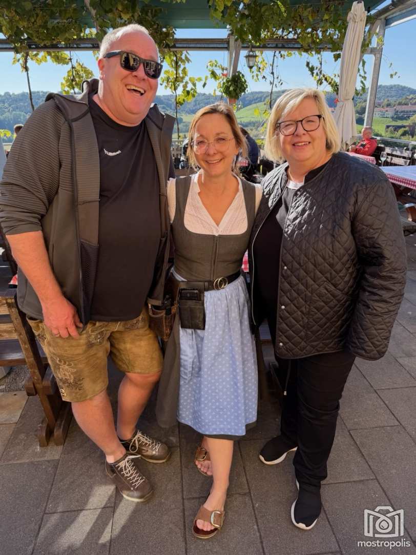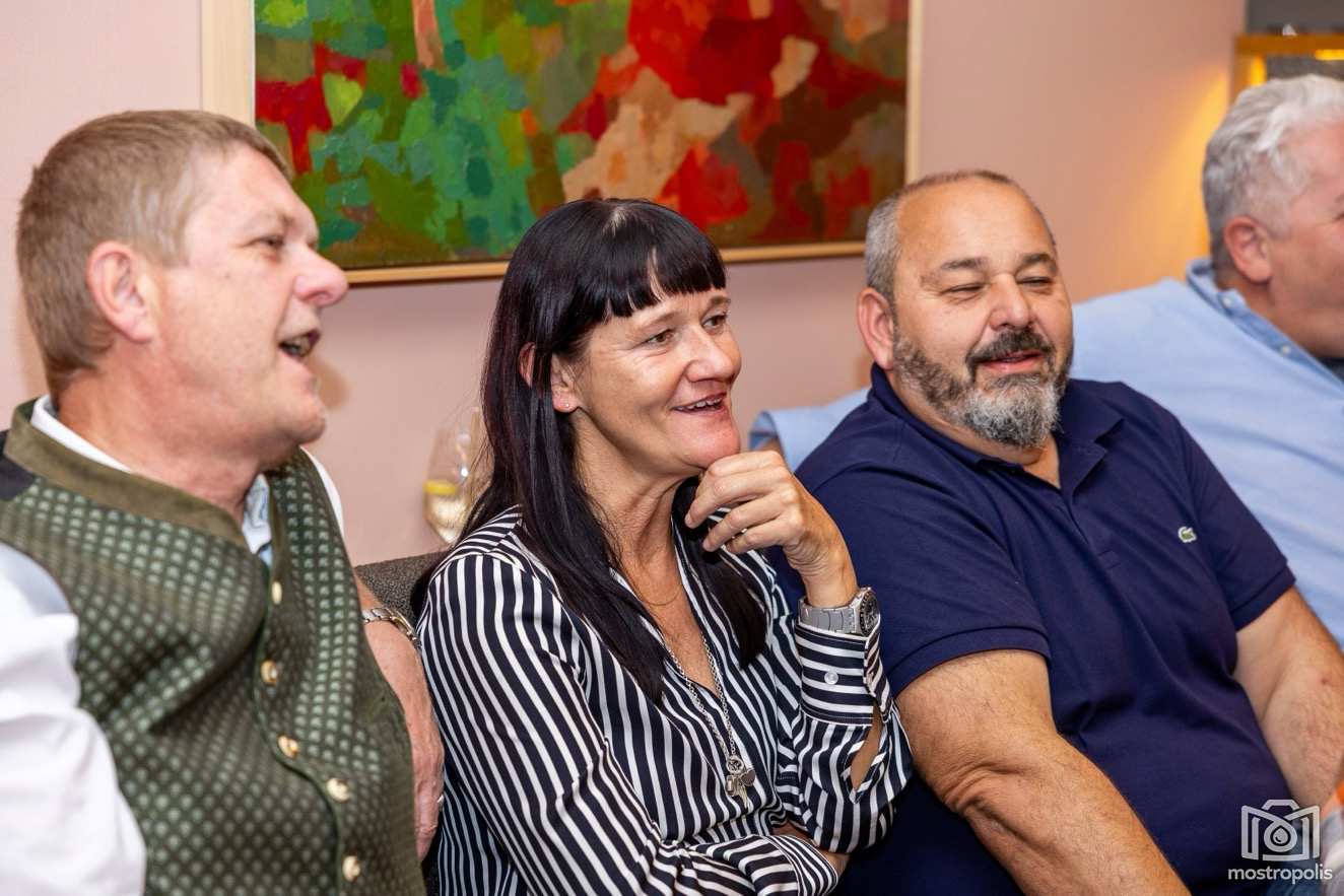 Perfekt organisiert von Jutta Koczirz ging es mit leichten Startschwierigkeiten zum Winzerfrühstück und Weinverkostung bei den Schwertführerinnen in Sooss, wo uns Kellermeisterin Kerstin und Heurigenchefin Sigrid das Weingut bzw. die Produktion sowie den Heurigen vorstellten. Bescheiden im Hintergrund Christine und Johann Schwertführer, die nach wie vor ihren beiden Töchtern nicht nur mit Rat, sondern immer noch mit Tat zur Seite stehen. Im Anschluss ging es weiter nach Riegersburg, wo uns Silvia Bernhart vom gleichnamigen Weingut mit Buschenschank mit einer üppigen Winzerjause samt Weinverkostung bereits erwartete. Gestärkt und gut gelaunt checkte dann die illustre Runde im wunderschönen Genusshotel Riegersburg ein. Die freie Zeit nutzten einige zum Spazieren, Kuscheln, Weitertrinken oder Wellnessen. Am Abend gab es dann ein 5-gängiges Menü mit Weinbegleitung, bestens kommentiert von Sommelier Lukas Fleck. Beeindruckt hat sie alle auch das Kennenlernen von Edi, dem singenden Baggerfahrer auf Feldkirchen bei Mattighofen, der mit seinen Gesangseinlagen alle begeisterte. Hier gibt's ein kleines VIDEO dazu! Mit launigem Fachsimpeln bis nach Mitternacht fand der erste Tag einen gemütlichen Ausklang.