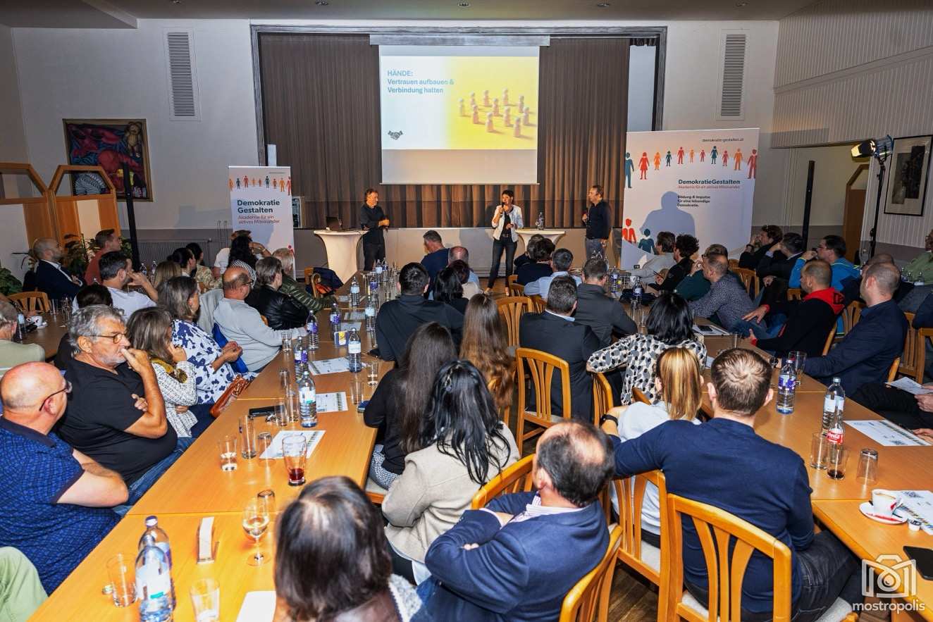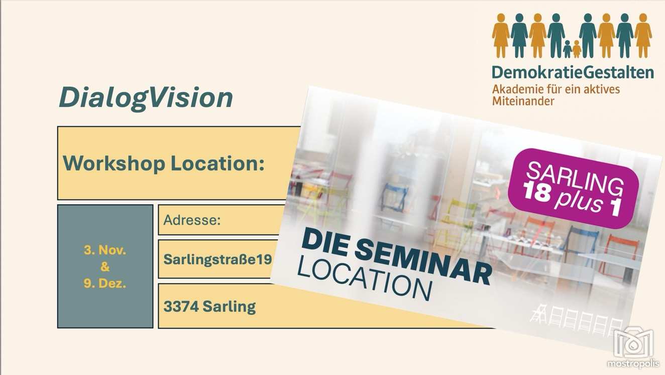 Die Präsenzworkshops finden in der Seminar Location Sarling 18 plus 1 statt. Weitere Infos sowie Details zum Mitmachen unter www.demokratie-gestalten.at.