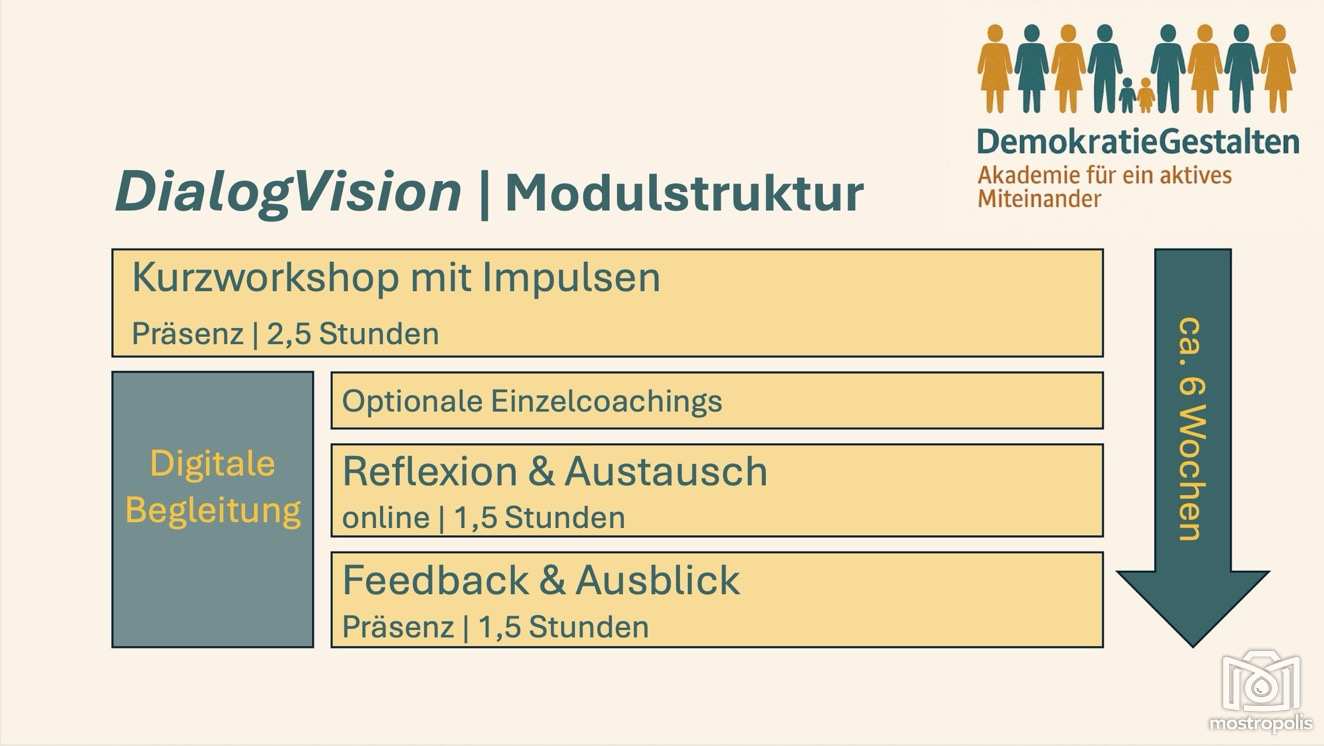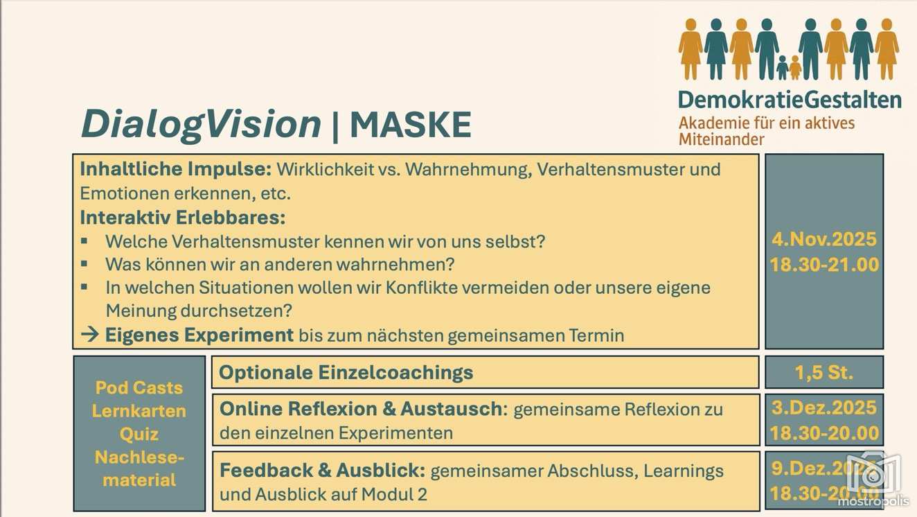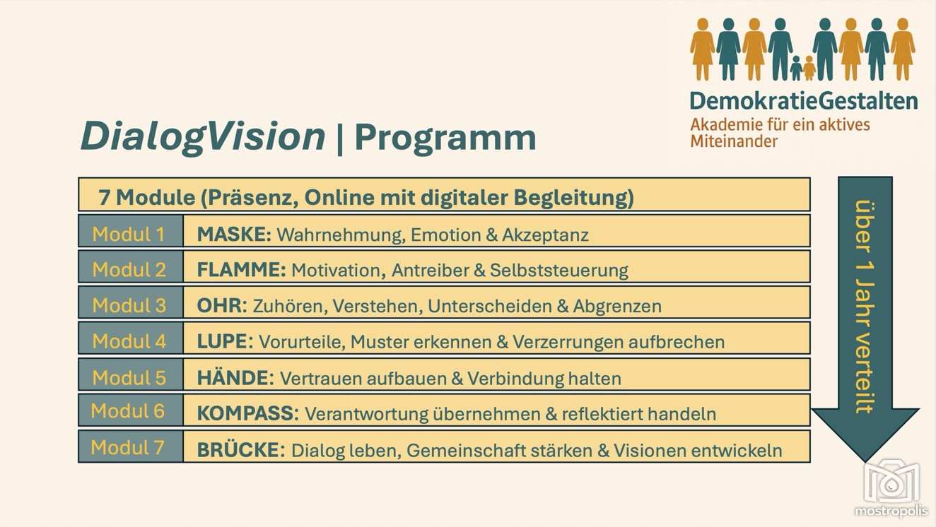 Im Modul 1 „Maske“ geht’s um Wahrnehmung, Emotion und Akzeptanz. Im Modul 2 „Flamme“ folgen Motivation, Antreiber und Selbststeuerung“. Weiter geht’s im Modul 3 „Ohr“ mit Zuhören, Verstehen, Unterscheiden und Abgrenzen. Im Modul 4 „Lupe“ folgen Vorurteile, Muster erkennen und Verzerrungen aufbrechen. Im Modul 5 „Hände“ werden die Themen Vertrauen aufbauen und Verbindung halten erläutert. Im Modul 6 „Kompass“ geht es um Verantwortung übernehmen und reflektiert handeln. Als letztes und 7 Modul „Brücke“ folgen Dialog leben, Gemeinschaft stärken und Visionen entwickeln.