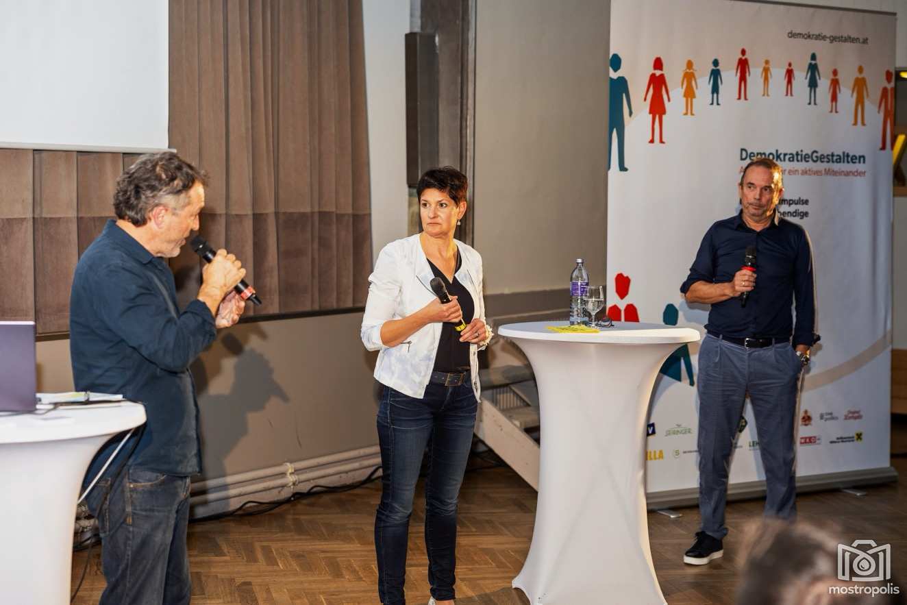 Zum Auftakt fand im Bärensaal des Landgasthofes Bärenwirt in Petzenkirchen ein erster Infoabend mit dem Titel „DialogVision stärkt Demokratie“ statt. Präsentiert wurde das Programm von Digitalisierungsmanager Peter Brandstetter und Organisationsberaterin, Systemischer Coach und Trainerin Luise Leputsch, welche immer wieder Toni Haubenberger um Vertiefungen ersuchten, die dieser mit Fallbeispielen aus seinem privaten, wie beruflichen Leben untermauerte. Das ganze Programm wird von Bernhard Brunnthaler vom Department für Wissens- und Kommunikationsmanagement der Donau-Uni Krems begleitet.