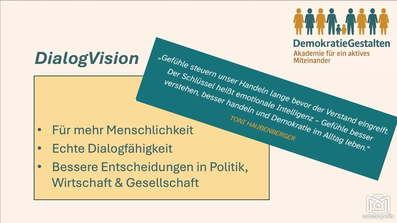 Der Verein ist eine Non-Profit Organisation und wurde von Toni Haubenberger, einem erfolgreichen Unternehmer und Neurowissenschafter, gegründet und versteht sich als Impulsgeber für eine neue Kultur des Zuhörens, Verstehens und gemeinsamen Handelns. Demokratie beginnt dort, wo Menschen Verantwortung übernehmen - in der Gemeinde. Eine gerechte, funktionierende Gesellschaft braucht Entscheidungen, die nicht nur rational durchdacht, sondern auch menschlich und neurobiologisch stimmig sind. „Gefühle steuern unser Handeln lange bevor der Verstand eingreift. Der Schlüssel heißt emotionale Intelligenz – Gefühle besser verstehen, besser handeln und Demokratie im Alltag leben.“, so Toni Haubenberger.