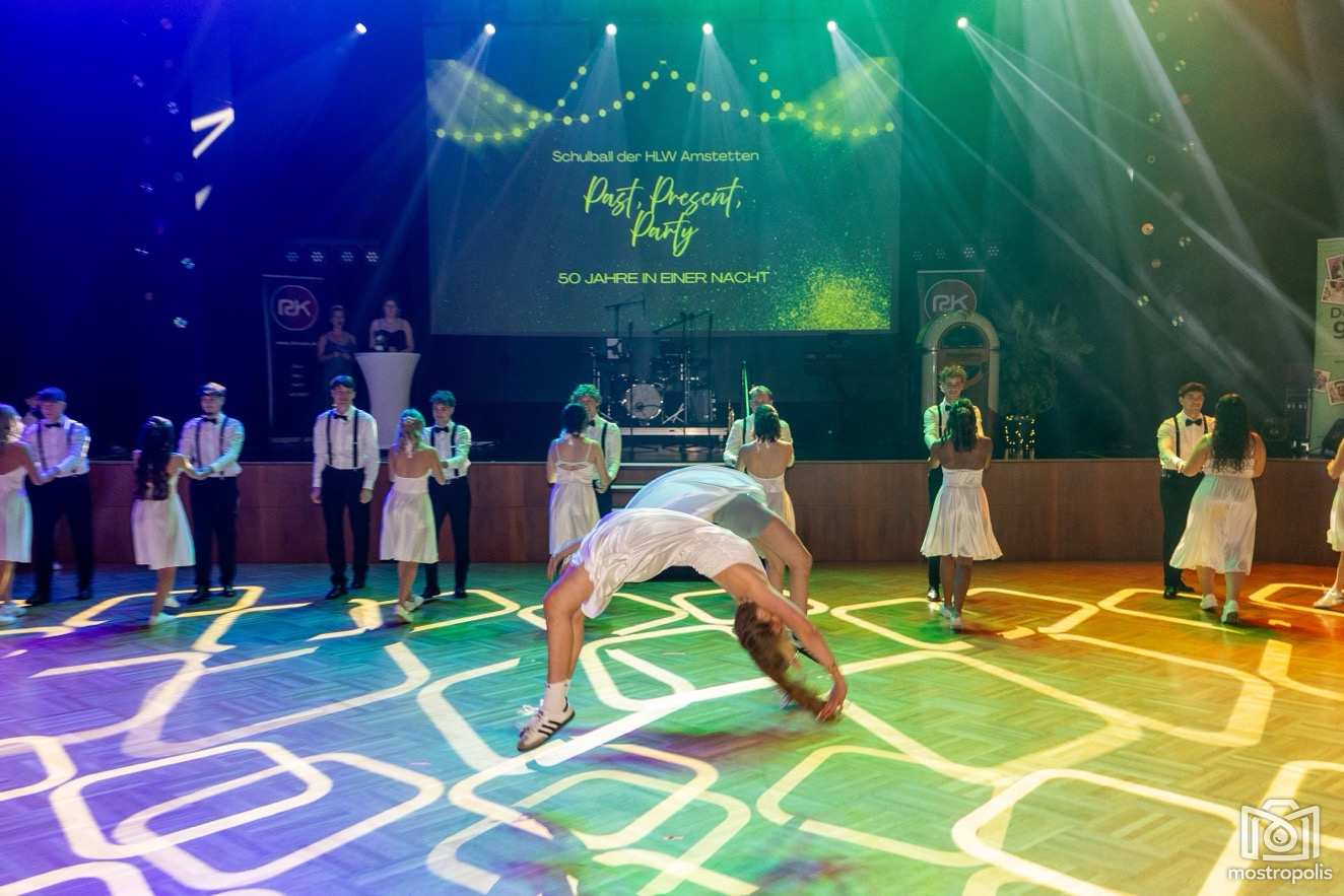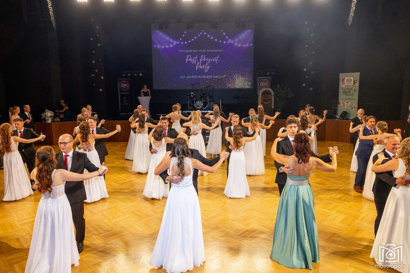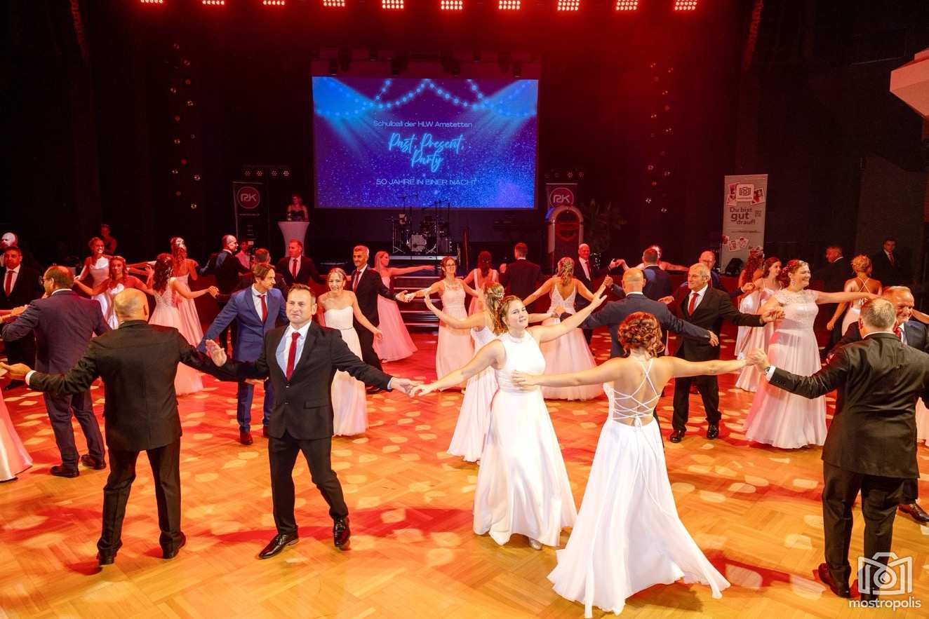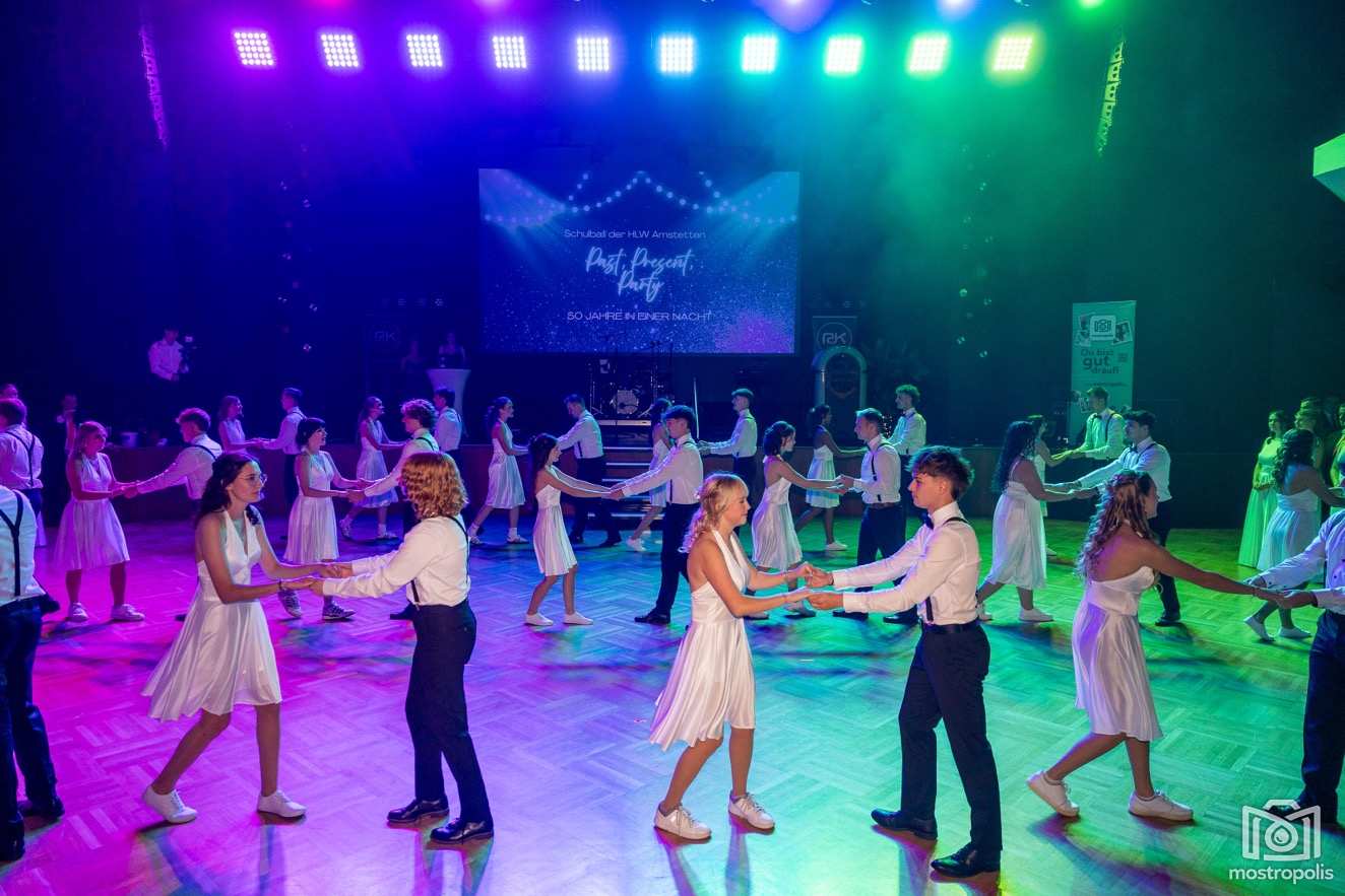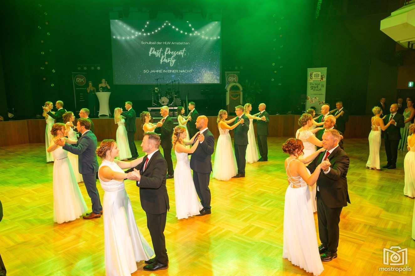 Karl Schlager hat eine bezaubernde Polonaise mit 42 Pärchen mit Vätern, einem Paar mit einer Mama sowie 19 Paaren mit Freunden einstudiert, die beeindruckte und viele berührte. Geboten wurde eine Bottle-, Disco-, Wein- und Cocktailbar sowie eine Absolventenbar mit Prosecco und Kaffee. Nicht fehlen durfte auch eine Fotobox und das Glücksrad im ersten Stock. Für schwungvolle Tanzbeine sorgte das Tanzorchester im Ballsaal und die Schulband in der Sporthalle, welche zu späterer Stunde DJ Alex Morgan mit fetten Beats so richtig zum Beben brachte.