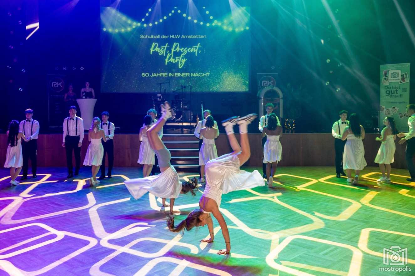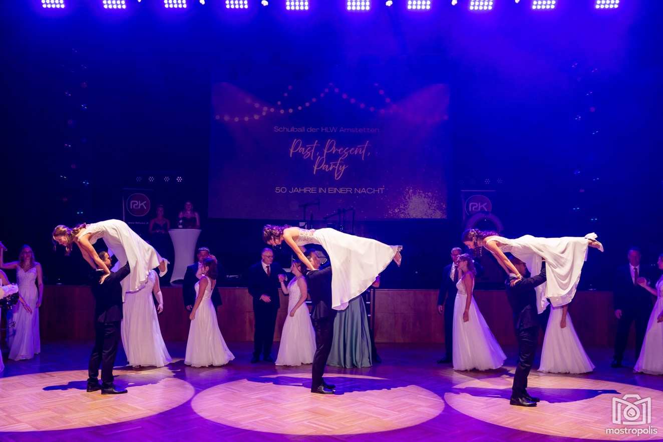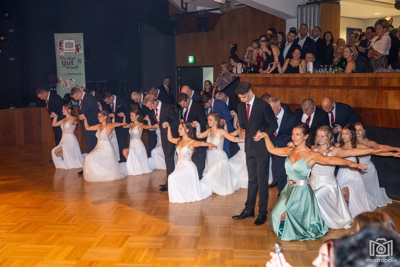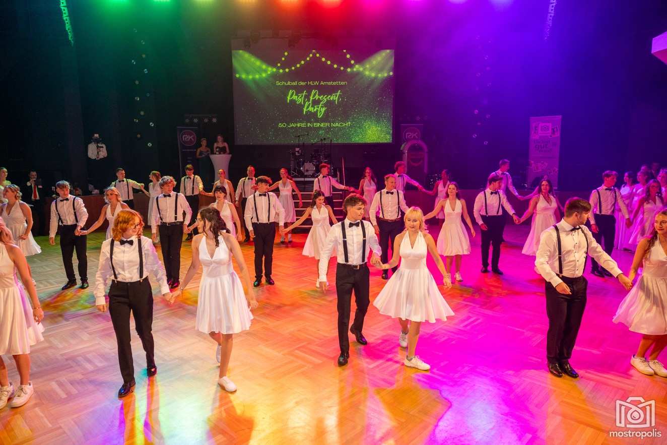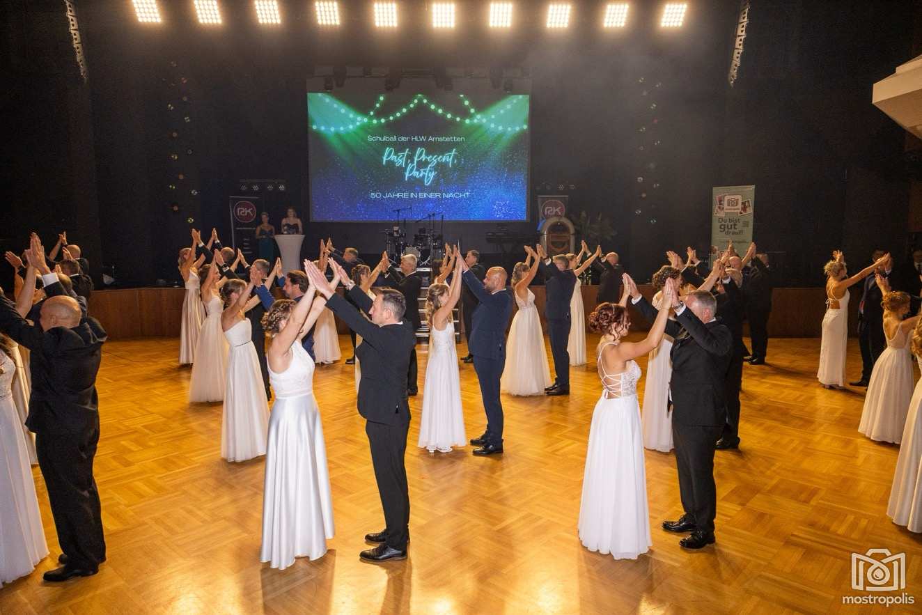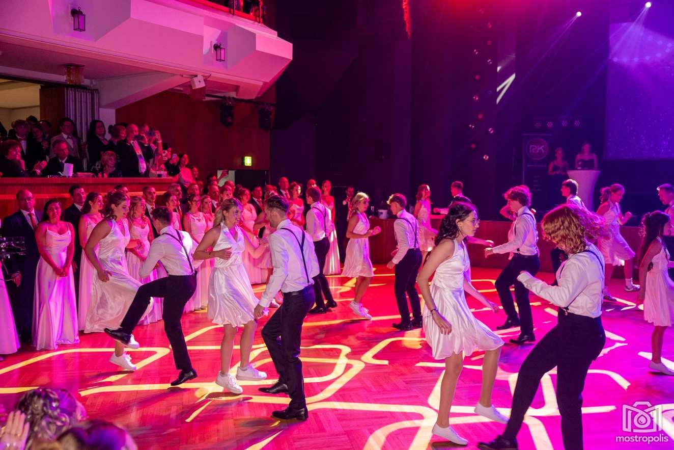 Karl Schlager hat eine bezaubernde Polonaise mit 42 Pärchen mit Vätern, einem Paar mit einer Mama sowie 19 Paaren mit Freunden einstudiert, die beeindruckte und viele berührte. Geboten wurde eine Bottle-, Disco-, Wein- und Cocktailbar sowie eine Absolventenbar mit Prosecco und Kaffee. Nicht fehlen durfte auch eine Fotobox und das Glücksrad im ersten Stock. Für schwungvolle Tanzbeine sorgte das Tanzorchester im Ballsaal und die Schulband in der Sporthalle, welche zu späterer Stunde DJ Alex Morgan mit fetten Beats so richtig zum Beben brachte.