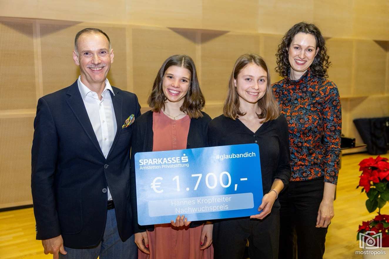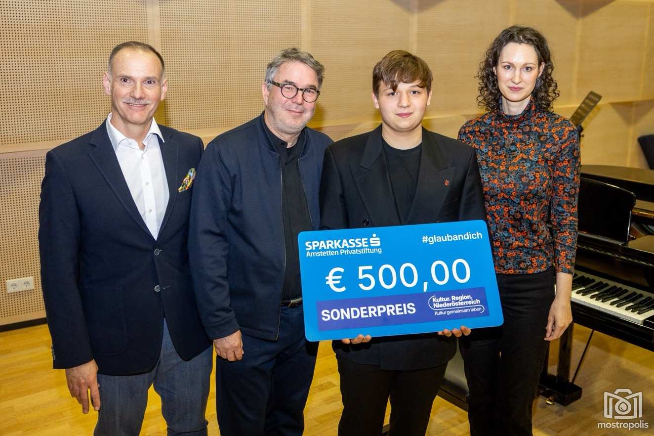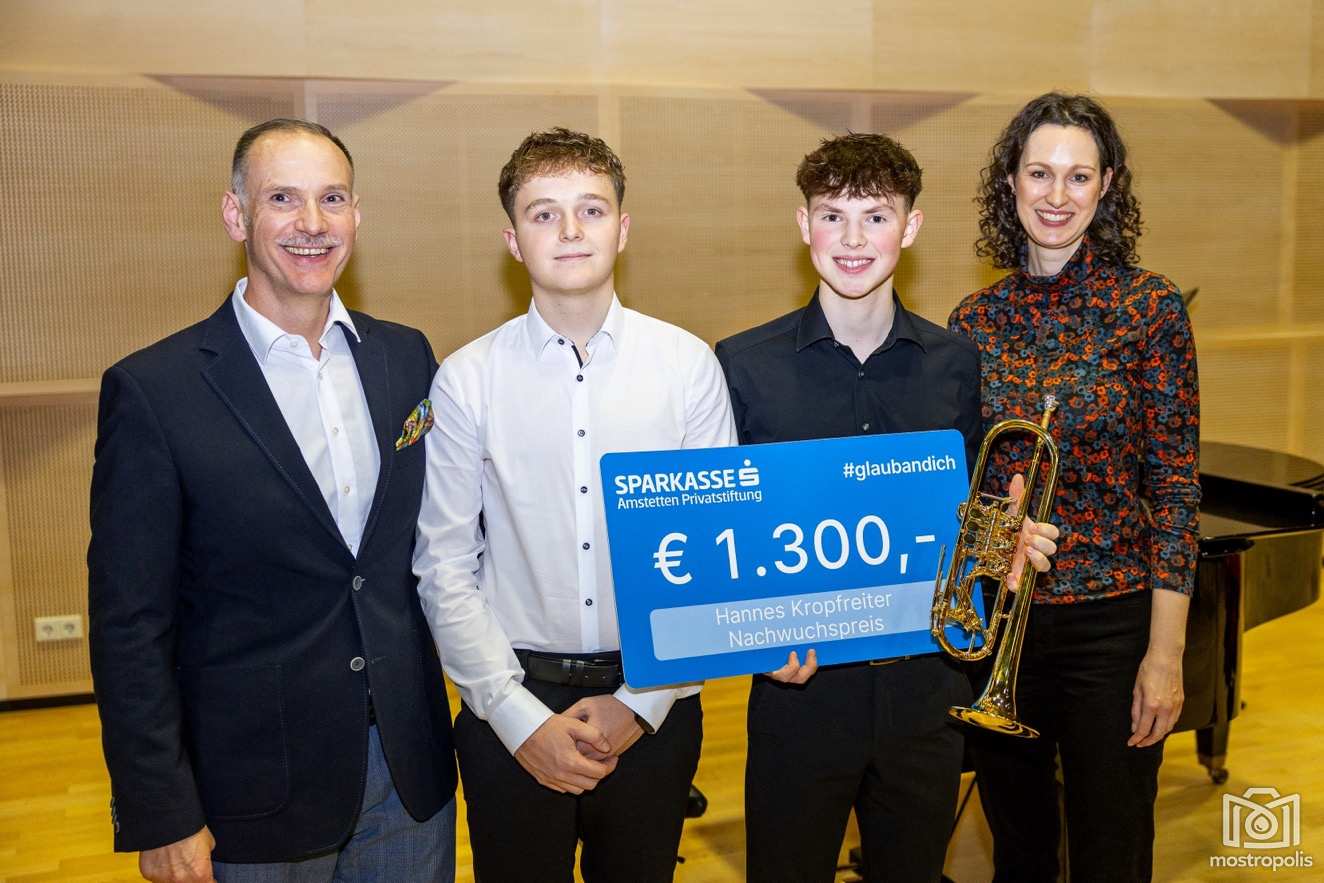 Mit Unterstützung der Sponsoren Agentur .. und punkt, Hausärzteteam Allersdorf, Senker Gruppe, Sparkasse Amstetten Privatstiftung, umdasch group, Ott Immobilien, AVB / Stadtkultur Amstetten sowie der Kultur.Region.Niederösterreich konnte ein Preisgeld von insgesamt € 4.500, - lukriert werden. Nach Jury-Entscheid lautete der diesjährige Preisträger in der Altersgruppe der 14-17 Jährigen Christoph Einfalt (Trompete) und die Preisträgerin der Altersgruppe der 18-21 Jährigen Magdalena Katzensteiner (Hackbrett). Überreicht wurden die Schecks gemeinsam mit den Vorjahressieger Jonathan Rumpl und Karoline Siegel. Die Sonderpreise der Kultur.Region.Niederösterreich gingen an Joana Frischer (Akkordeon), Antonia Huber (Cello) und Christian Ziemski (Gesang).