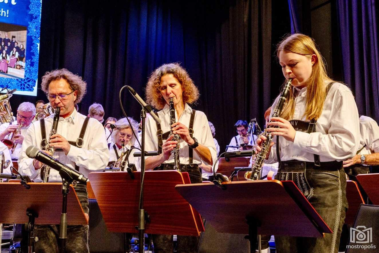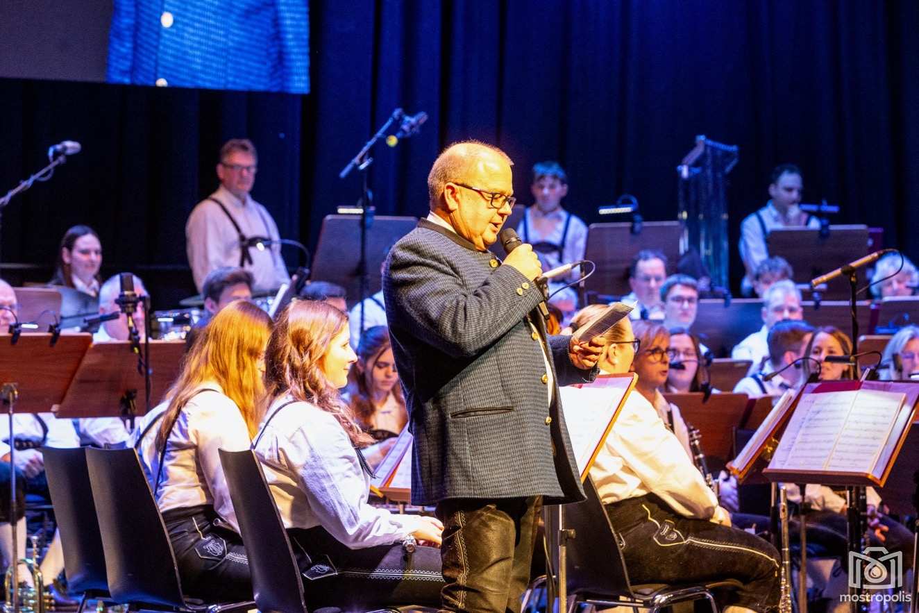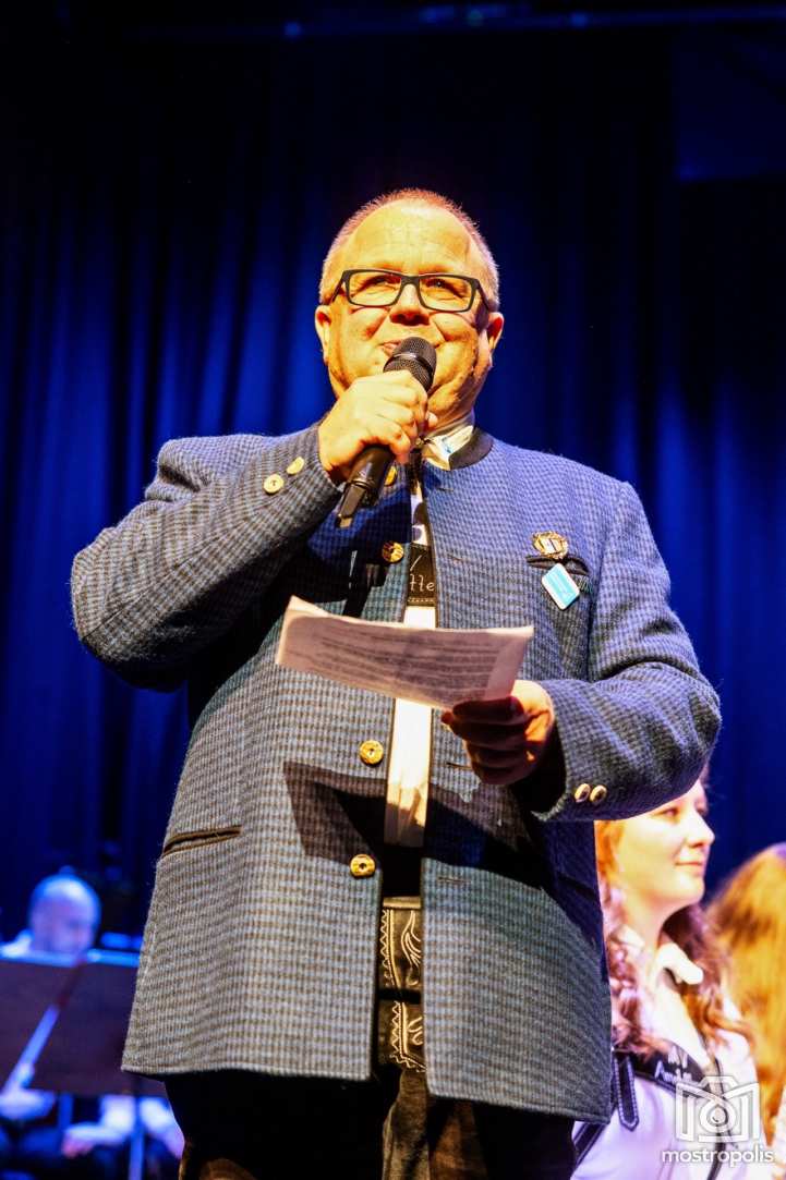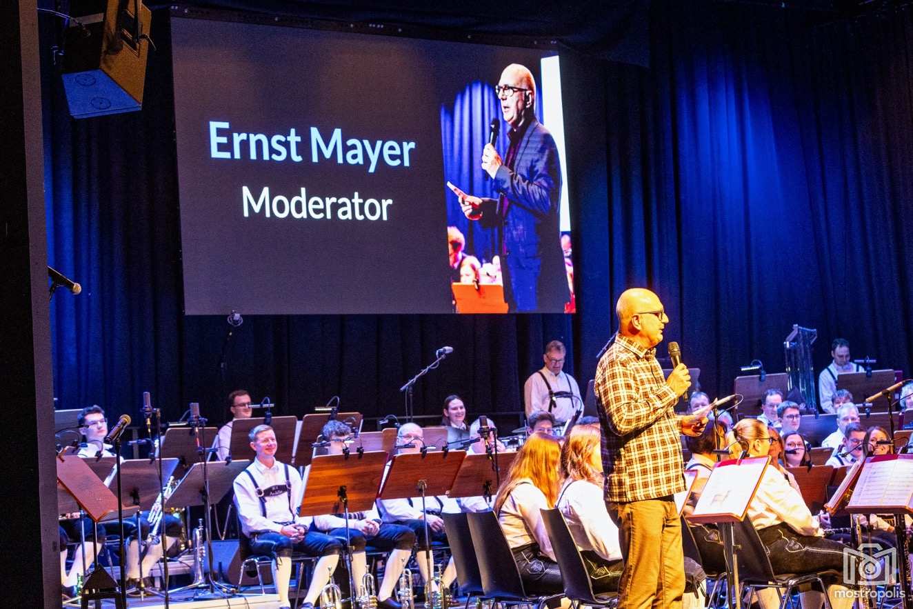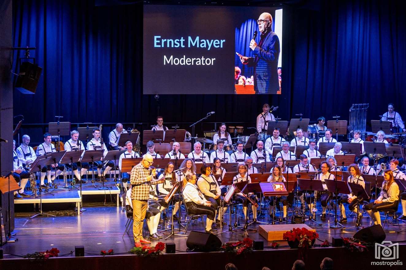 Nach der Begrüßung durch Obmann Herbert Klaus führte mit gewohnt launigem Charme Moderator Ernst Mayer durch das abwechslungsreiche Programm. Heuer reichte der musikalische Bogen von Fanfare und Marsch über alpine Inspirationen (in Erinnerung an die Konzertreise nach Wolkenstein/Südtirol) bis hin zu Bette Midler und einem Medley in Gedenken an Udo Jürgens.