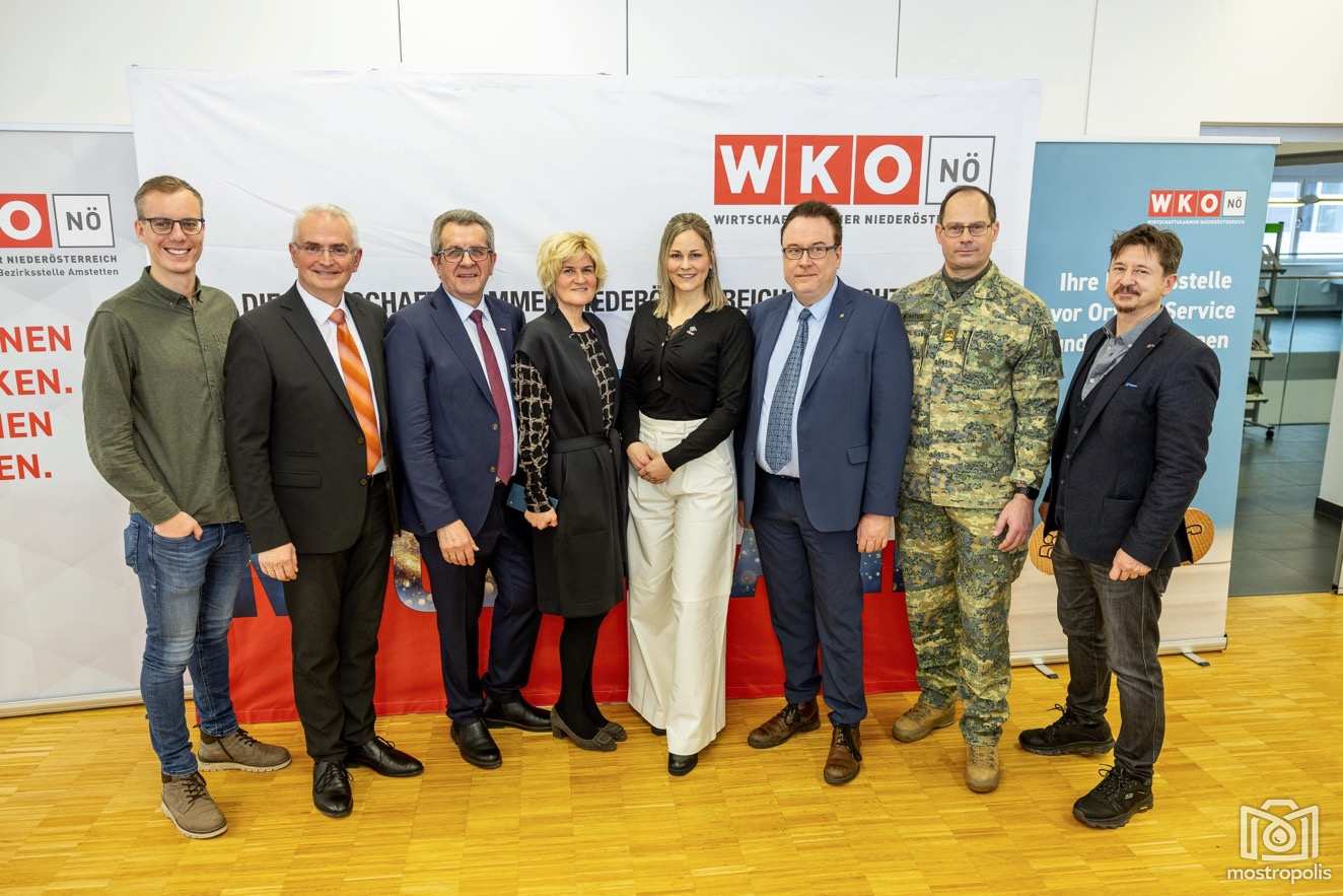 1.Foto, v.l.: Daniel Eder (Junge Wirtschaft Bezirk Amstetten), WK-Leiter Andreas Geierlehner, WK-Obmann Gottfried Pilz, WK Dir.-Stv. Alexandra Höfer, Sandra Friedl-Brenner (Frau in der Wirtschaft Bezirk Amstetten), Serge Preslmaier (Fachgebietsleiter Umweltrecht BH Amstetten), Gregor Richter (Bataillonskommandant Jägerbataillon 12), Herbert Grurl (Bezirksstellenleiter Arbeiterkammer Amstetten)