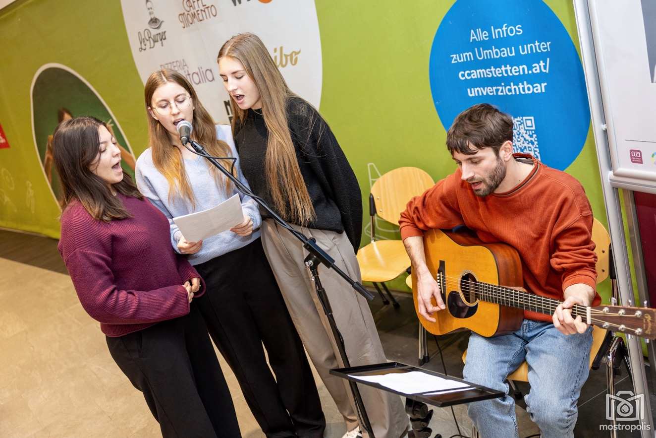 Vorletztes Foto: v.l. 2. Reihe: StR Stefan Jandl, Dir. Petra Osterer (Polytechnische Schule Amstetten), Dir. David Fuchs, Klassenvorstand Sigrid Fröschl, Bgm. Christian Haberhauer. Projektleiterin Doris Schwarz-König, NÖ Bildungsdirektor Karl Fritthum, StR Lisa Asanger u. Centerleiterin Katharina Gfrerer mit den SchülerInnen der 4. HLW