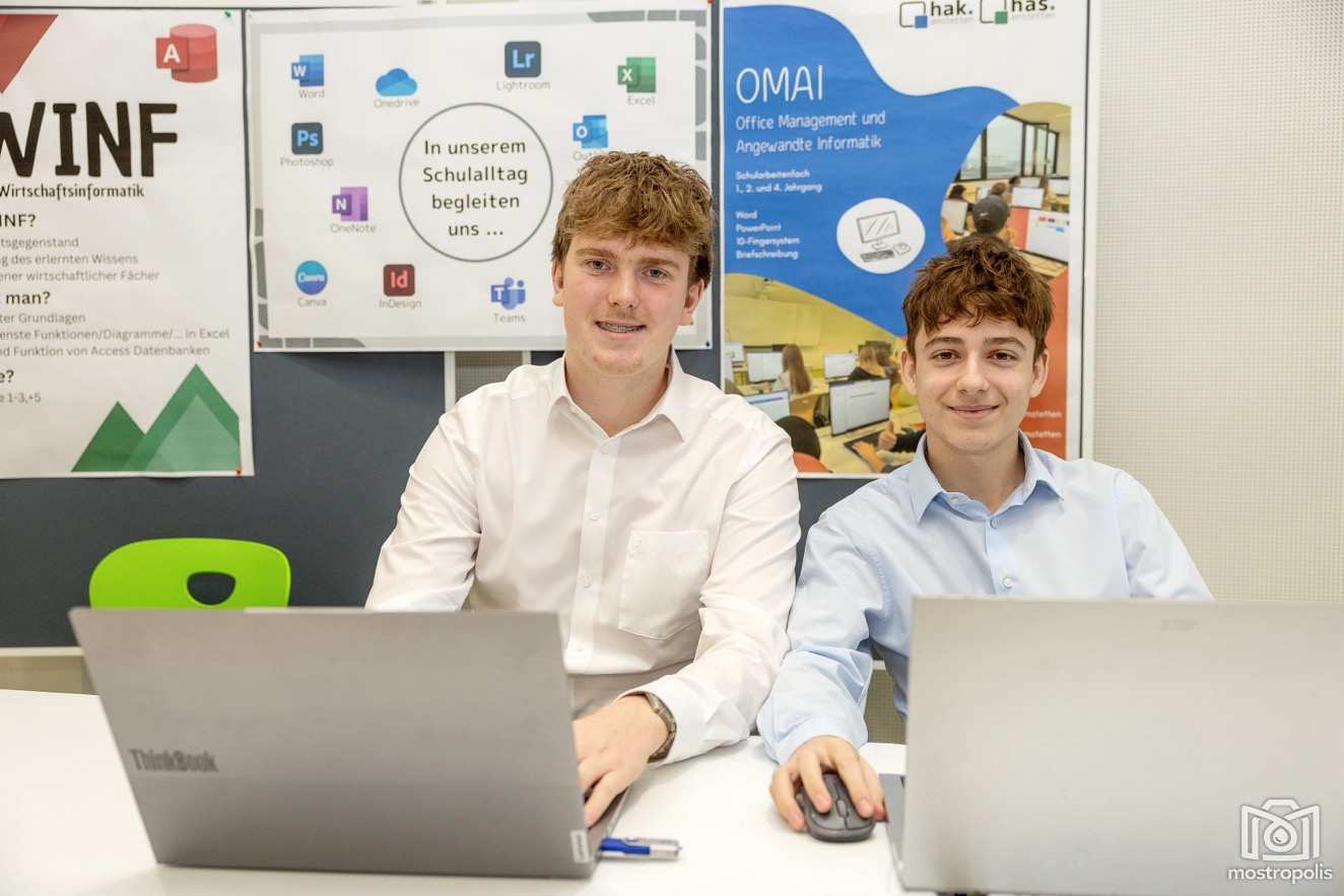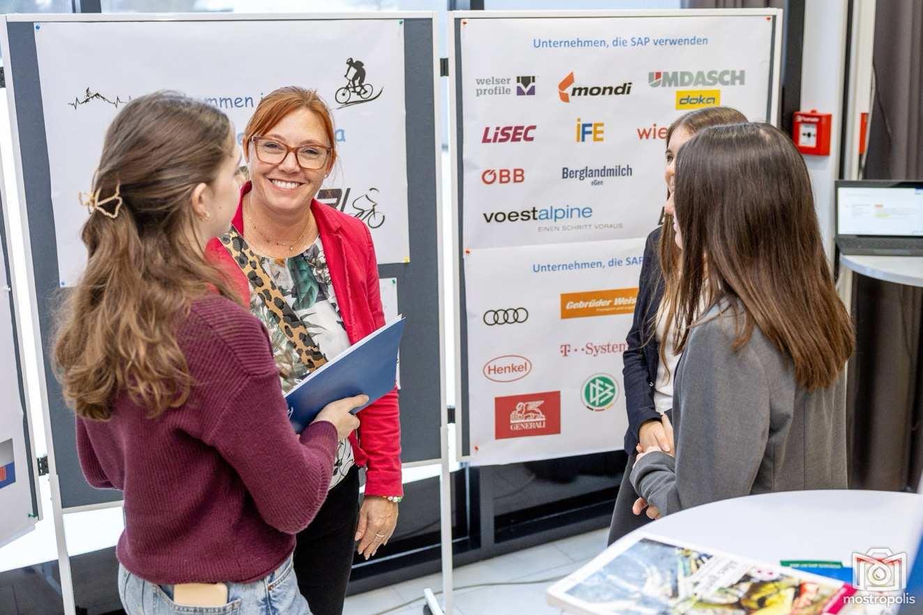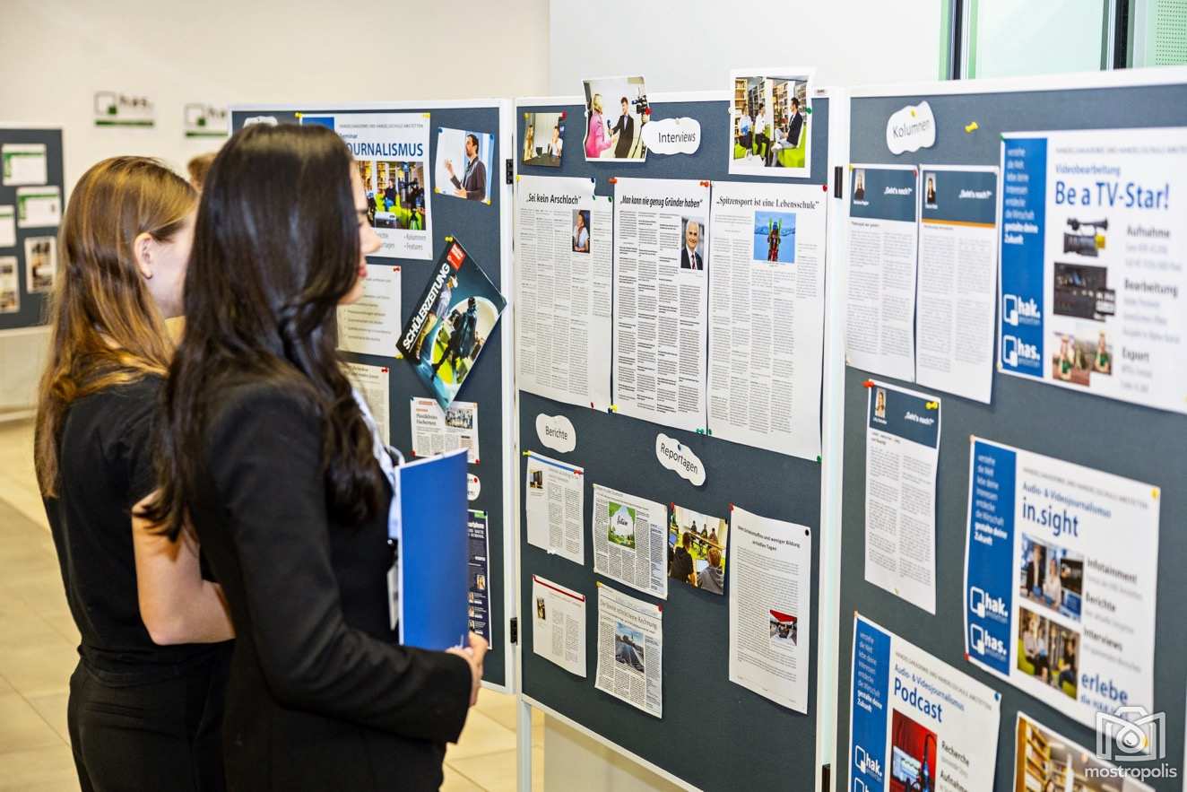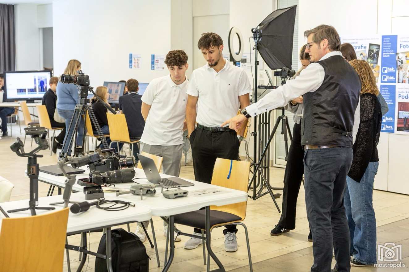 Im Fokus standen auch die drei Ausbildungsschwerpunkte der HAK. Wie man Fotos mit Software oder KI (Künstlicher Intelligenz) bearbeitet, eigene Webseiten gestaltet, programmiert, Imagefilme oder Werbevideos schneidet, Kamera-Equipment verwendet, zeigten der Schwerpunkt IKT (Informations- und Kommunikationstechnologie. Dem Einsatz der Firmensoftware SAP in den Bereichen Einkauf, Verkauf, Finanzbuchhaltung und Controlling widmet sich ein weiterer Schwerpunkt. Medienarbeit, Marktforschung, Eventplanung, Kampagnen u.v.m. stehen im Zentrum des Schwerpunkts KMMA (Kommunikationsmanagement und Marketing). Vorgestellt wurden u.a. eigene Produktinnovationen der SchülerInnen wie die App „Food 4 You“, die Restaurantsuche und -besuche erleichtern soll.