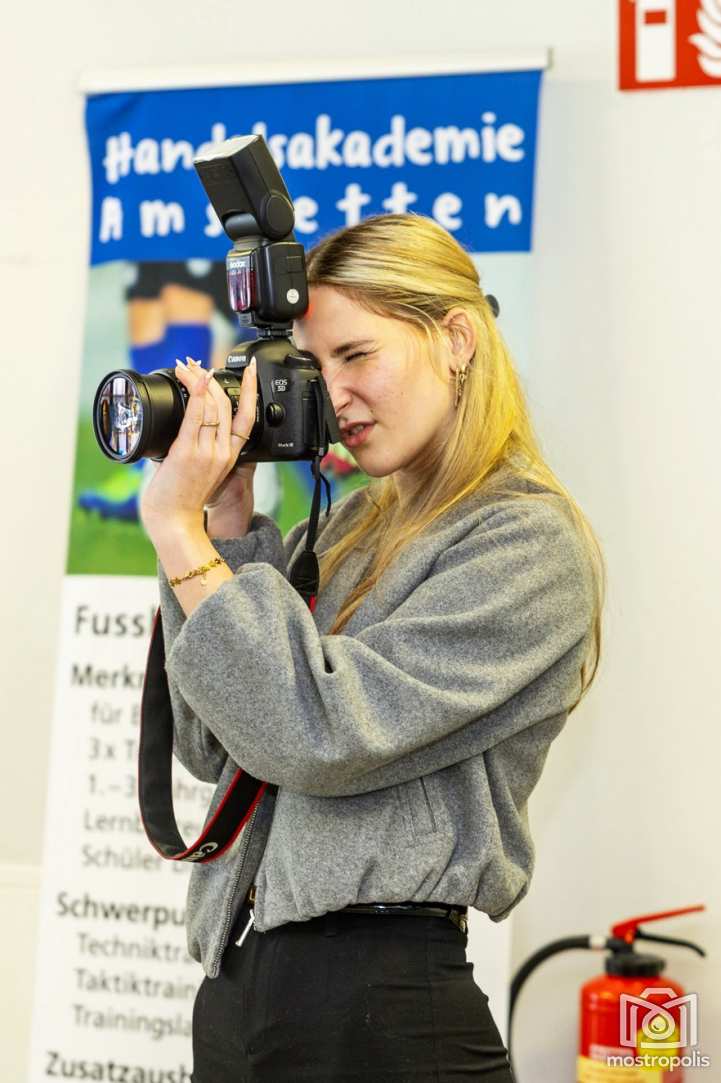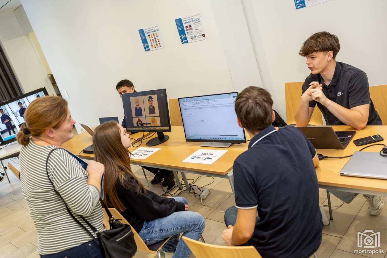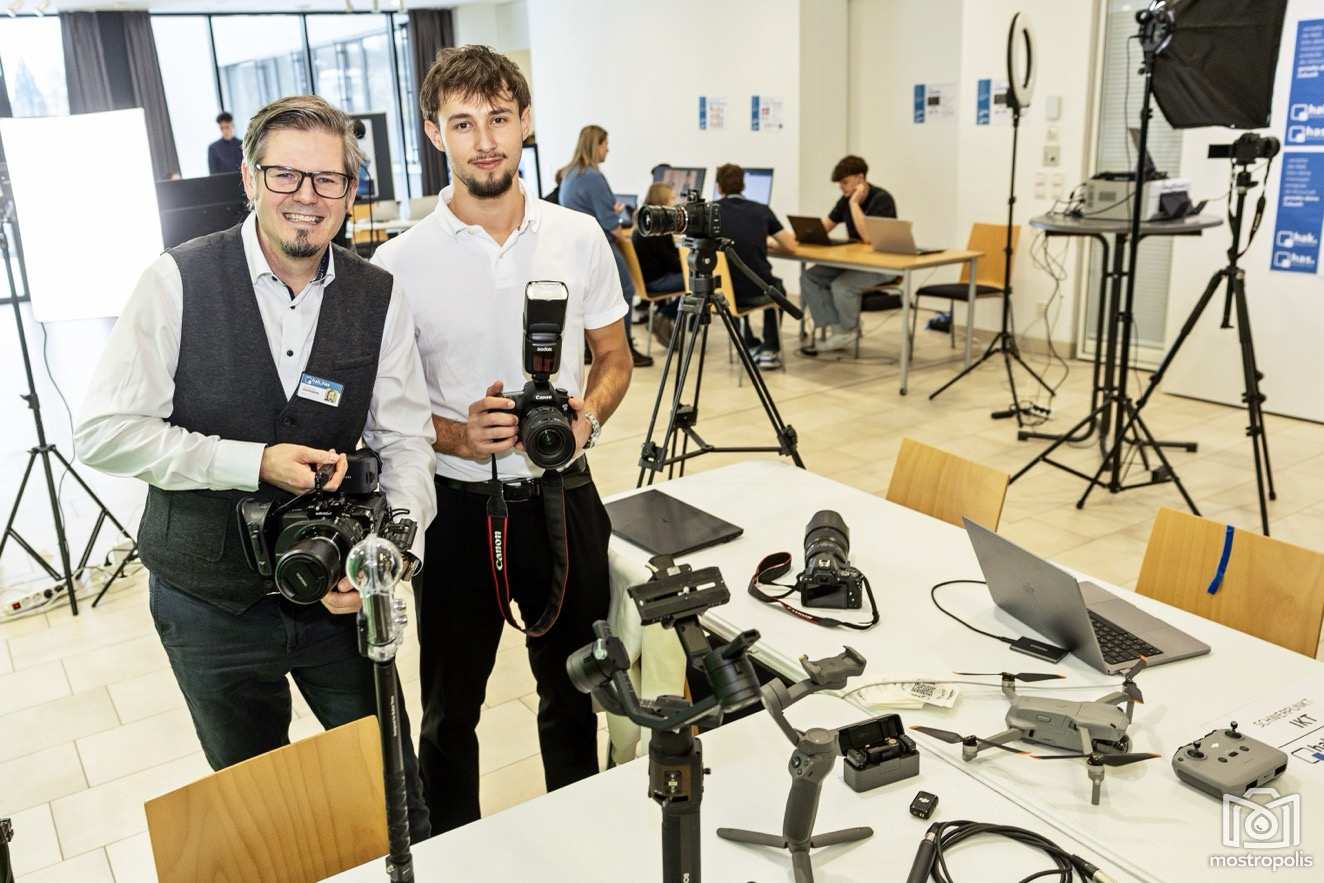 Was hinter den frei wählbaren Seminaren wie z.B. Coding, Vektorgrafiken, Journalismus, Neue Medientechnologie oder Audio- und Videojournalismus steckt, war im Erdgeschoß erfahrbar. So konnten die Besucher u.a. VR-Brillen testen, zusehen, wie ein Video mittels KI-Sounds in andere Sprachen übersetzt wird, sich selbst als Fernsehmoderatoren versuchen, Vektorgrafiken gestalten, beim Programmieren zusehen oder sich in der Fotobox fotografieren lassen.