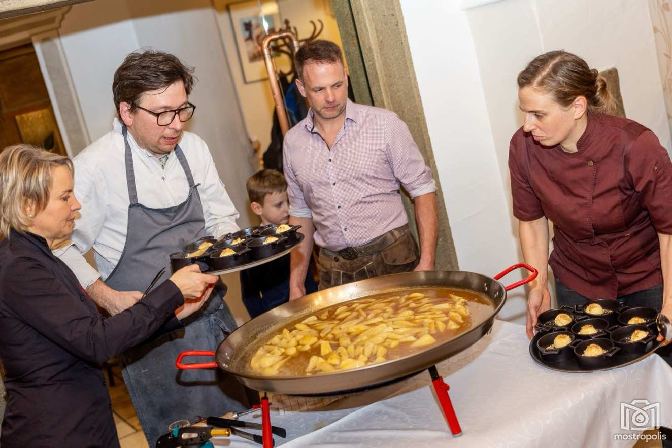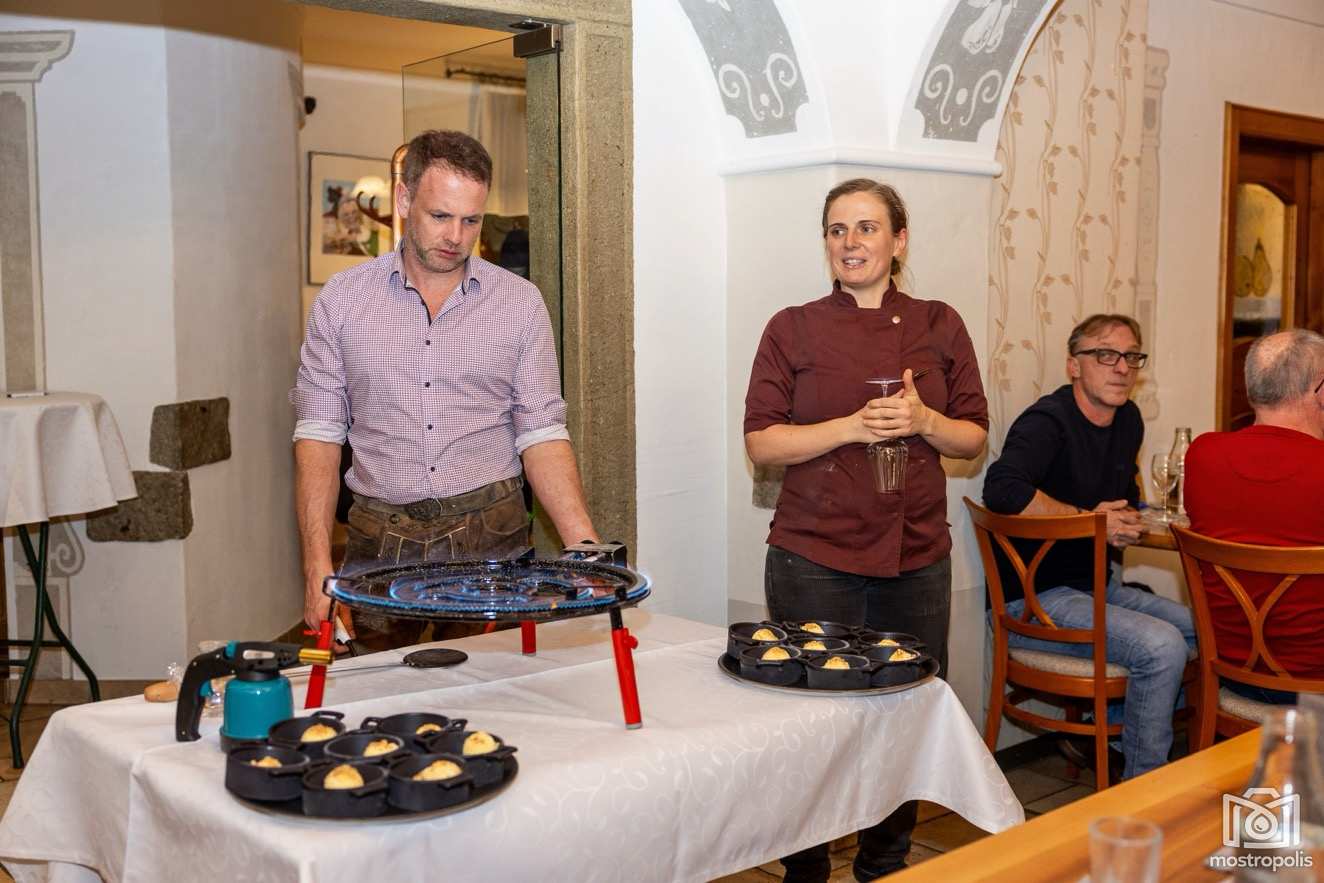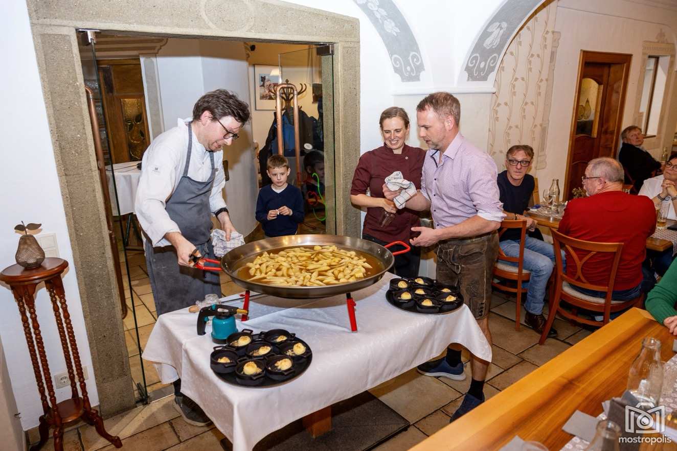 Küchenchef Thomas Naderer zauberte gemeinsam mit Maria Hauer erlesene Gaumenfreuden auf die Teller, wie Austern, Tacos al Pastor, panierte Avocadofingers, abgeflämtes Lachssushi mit Rosmarin, gebratene Ente mit Selleriepüree und Haselnusskrokant, Jerk Chicken mit Rum-Zwiebel Relish, flambierte Birne mit Vanilleeis und Hauer-Schmankerl.
