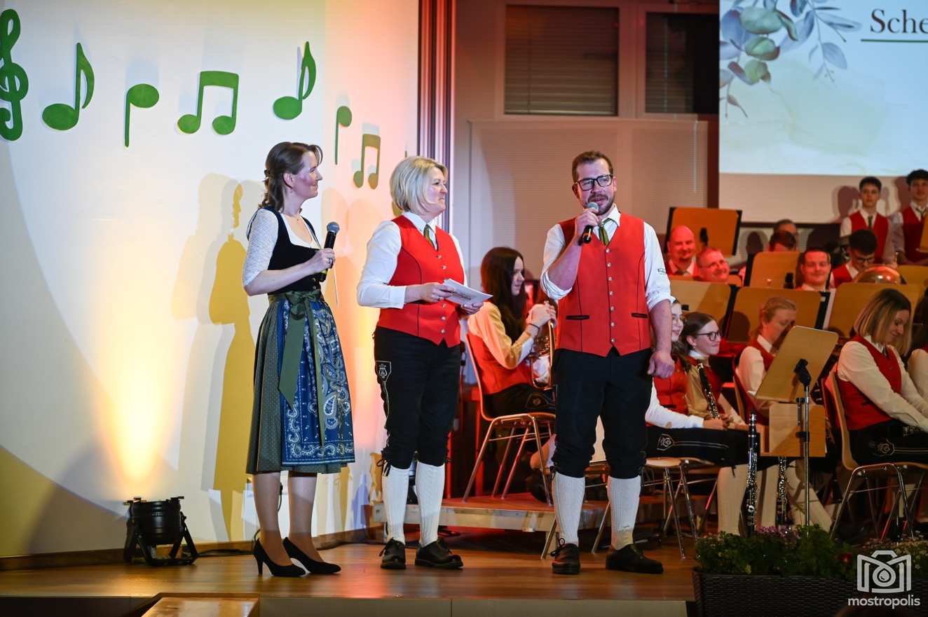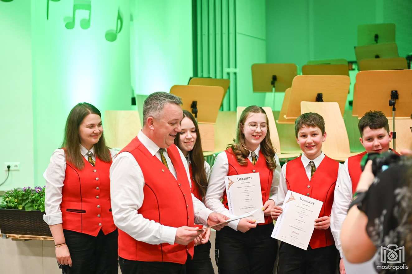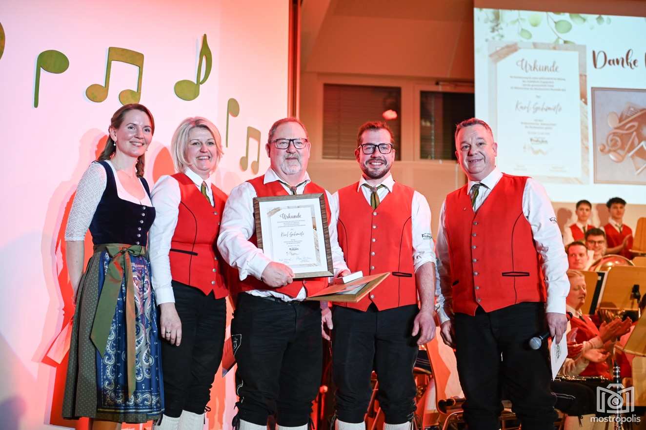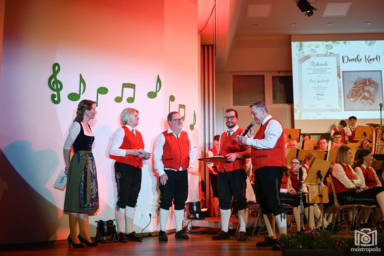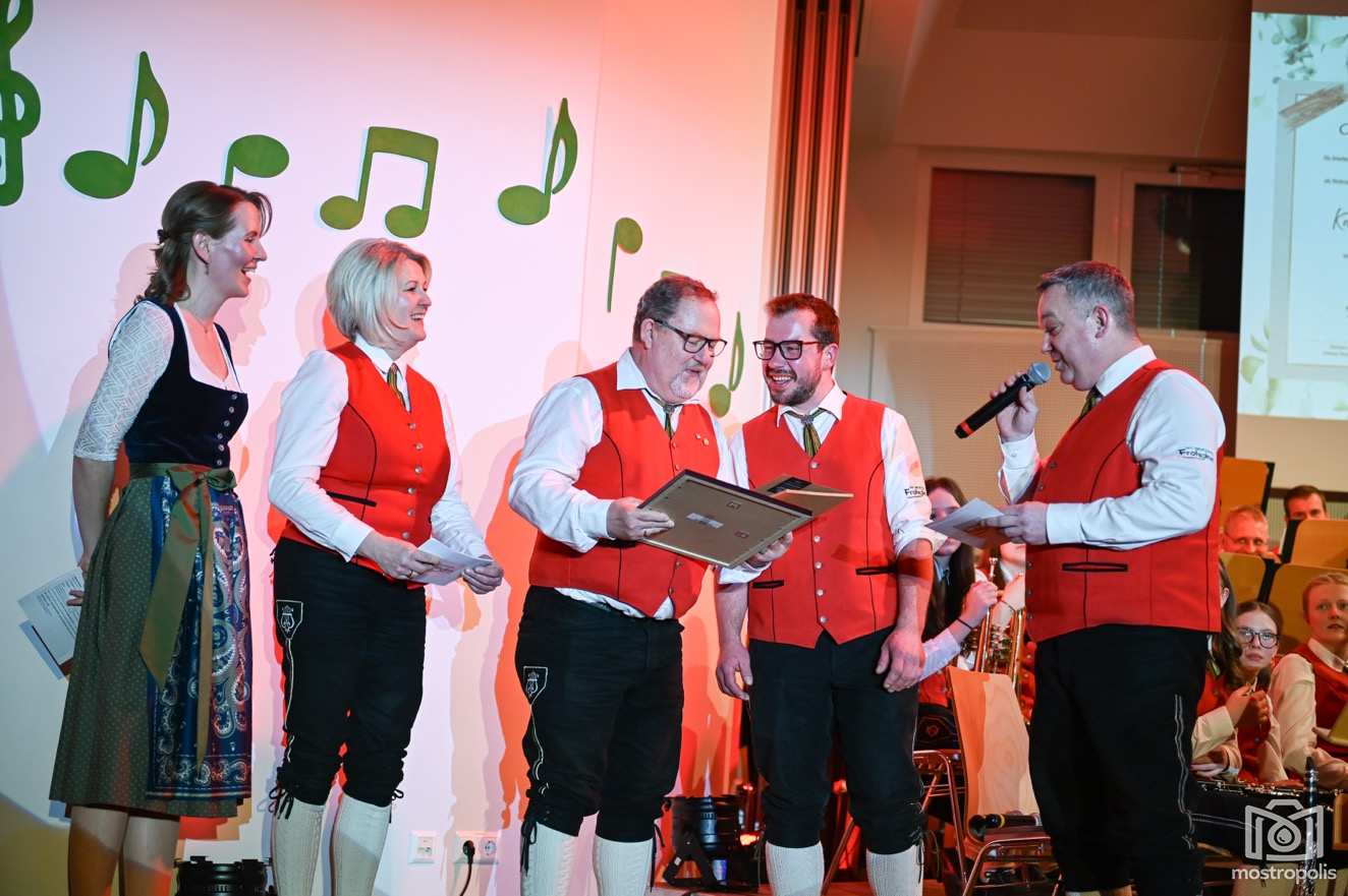 Besonderen Applaus erhielt das Jugendblasorchester, welches mehrere Stücke zum Besten gab. Der Musikverein unterstrich damit die große Bedeutung der Nachwuchsarbeit, die für die Zukunft des Vereins wichtig und unverzichtbar ist. Ein feierlicher Moment des Abends war die Ehrung von Karl Schmutz, der für seine langjährige und gewissenhafte Tätigkeit als Notenarchivar mit dem Verdienstzeichen „Notenarchivar“ ausgezeichnet wurde. Das Publikum würdigte seine Arbeit mit herzlichem Beifall.