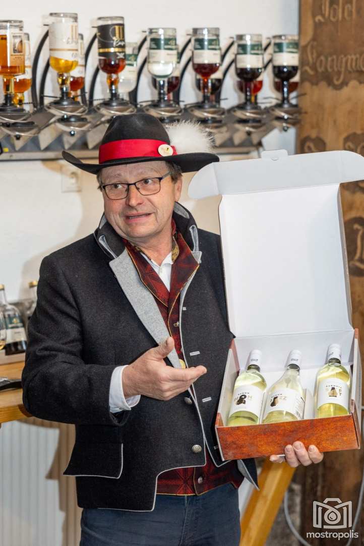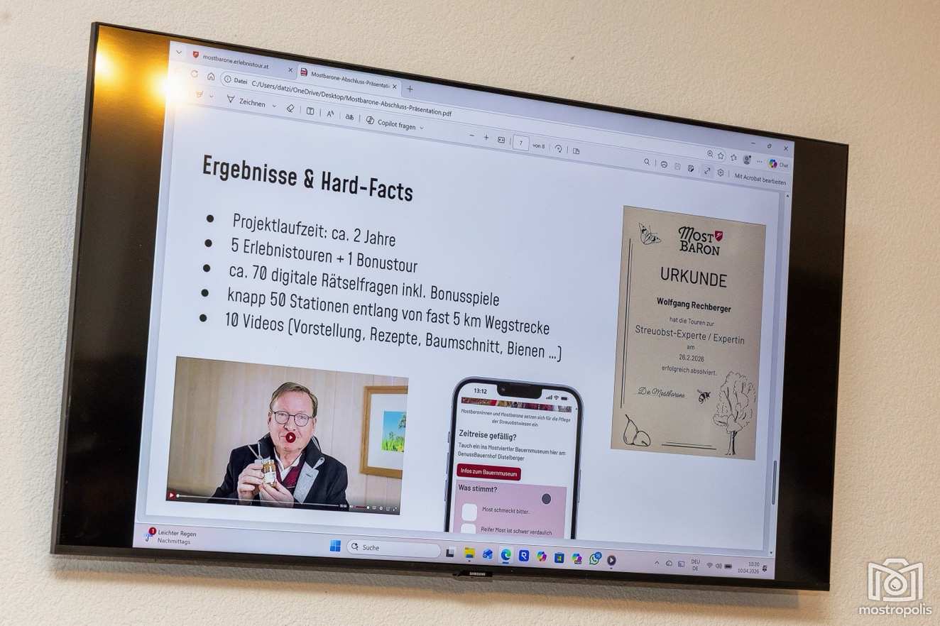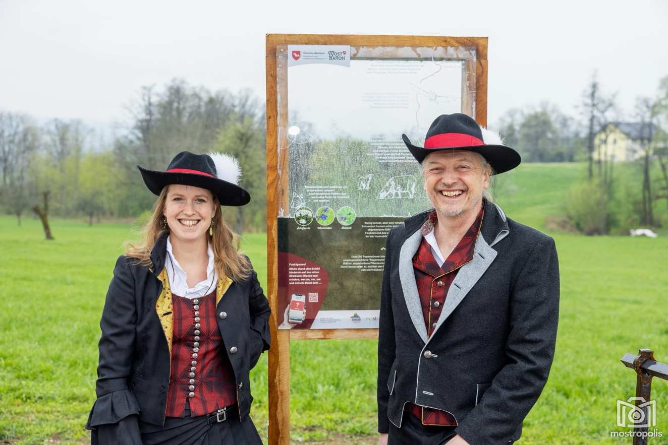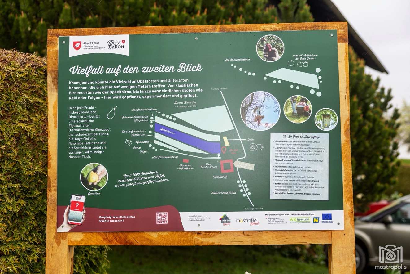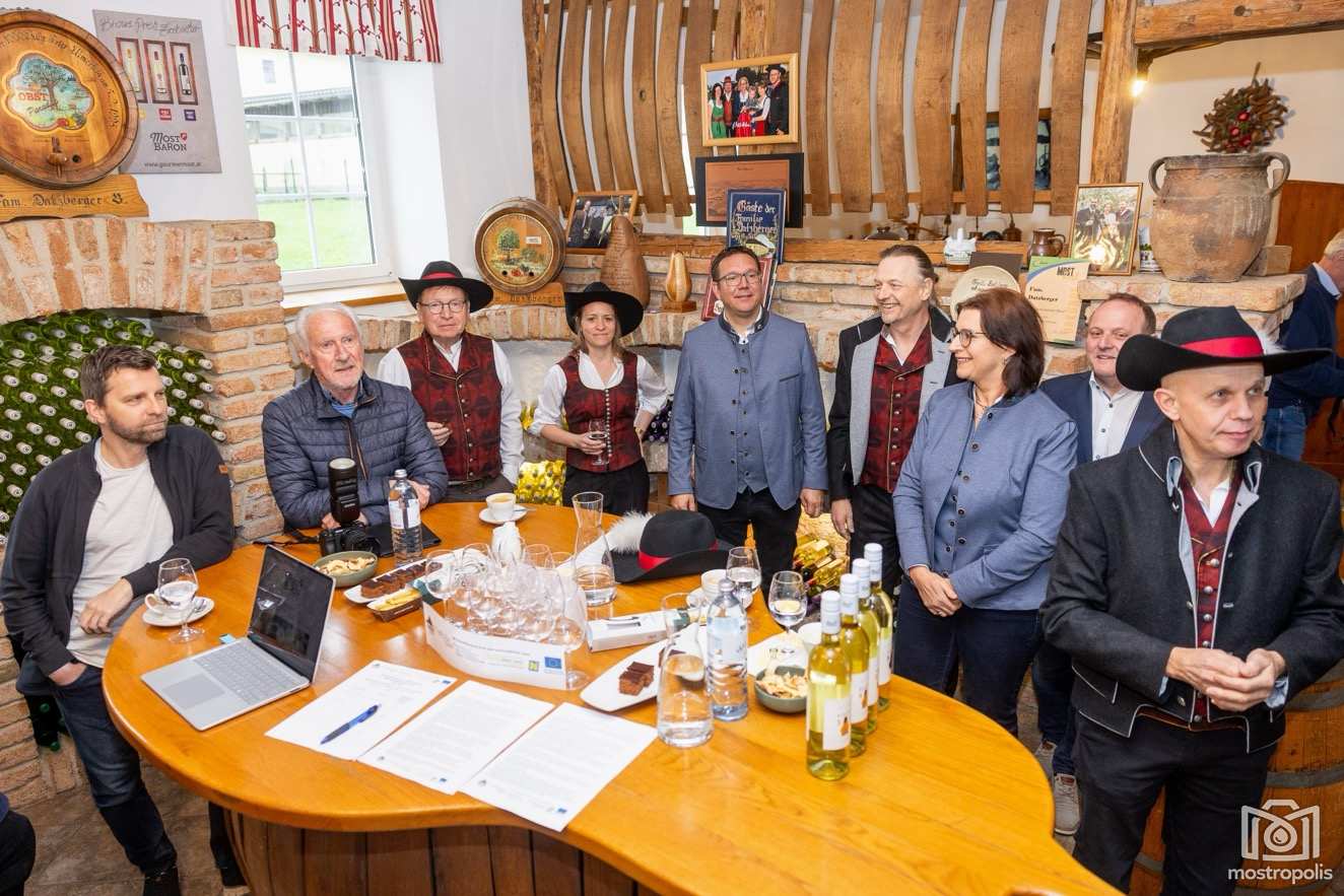 Beim Primus der Mostbarone, Bernhard „Seppelbauer“ Datzberger in Pittersberg, wurde das gemeinsame, überregionale LEADER-Projekt der Most- & Eisenstraße präsentiert. Im Mittelpunkt standen die Eröffnung der fünf neuen Streuobstwiesen-Lehrpfade, die Vorstellung des ersten Premium-Birnensaftes in Bio und konventioneller Qualität sowie neuer Produkte wie alkoholfreier Most und Frizzante.