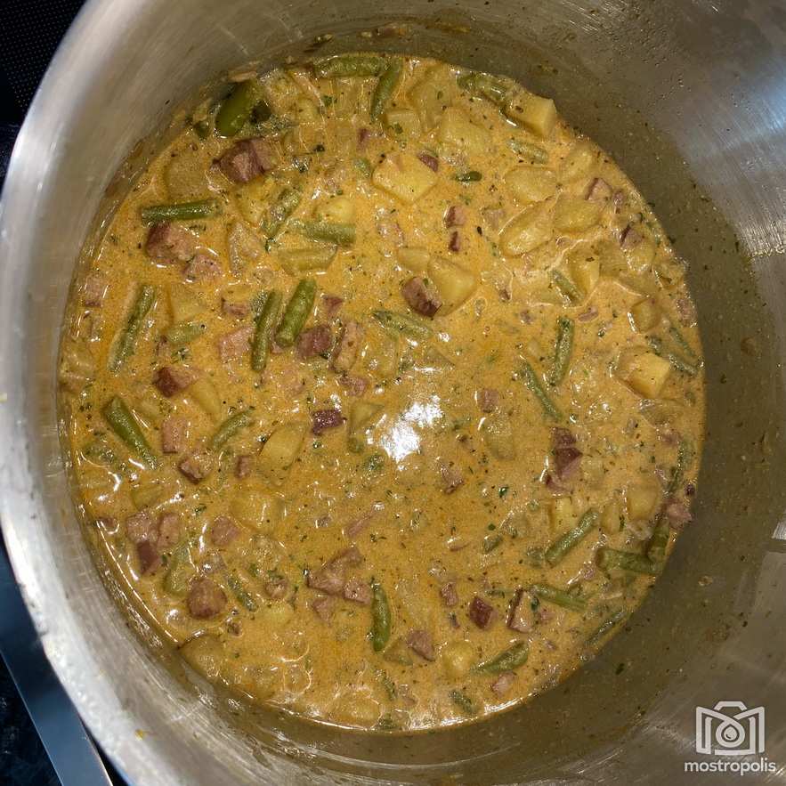 Dann die (gefrorenen) Fisolen einlegen und wenn diese schon ein wenig weich sind, die Erdäpfel dazu geben. Knoblauch reinpressen und mit Majoran und Kümmel würzen. Mit Salz und Pfeffer abschmecken.