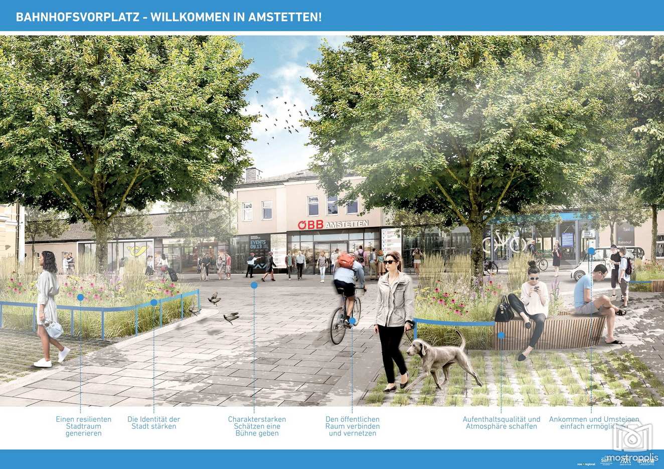 Akkordierend zu o.a. Ergebnissen attestierten auch die Planer von yewo, dass das Herz Amstettens der Hauptplatz ist und daher anstelle einer permanenten Fußgängerzone eine Begegnungszone kommen soll, wo überwiegend Fußgänger und Radfahrer das „Sagen“ haben sollen und Autofahrer mit maximal 20 km/h zu Gast sind. Die Aktionen im öffentlichen Raum sind daher Aufenthaltsqualität und Atmosphäre schaffen | für unterschiedliche NutzerInnengruppen planen | Nutzungsoffenheit und Vielfalt forcieren | mehr nutzbare, öffentliche Räume erschließen. Weitere Aktionen für das Stadtbild und seine Architektur sind Gebäuderücksprünge gestalten und nutzen | die Identität der Stadt stärken | charakterstarken Schätzen eine Bühne geben | für Klarheit und Sicherheit sorgen. Aktionen für die Mobilitätswende und neue Wege sind den öffentlichen Raum verbinden und vernetzen | Ankommen und Umsteigen einfach ermöglichen | eine Parkraumstrategie erarbeiten / die Topografie optimal nutzen. Die Aktionen für den Grünraum und das Stadtklima sind den Bachlauf zugänglich machen | bestehenden Grünraum aktivieren | einen resilienten Stadtraum generieren | diversen und erlebbaren Grünraum schaffen. Dabei waren sich alle einig, dass Amstetten viel mehr Potenziale hat, die derzeit noch zu wenig erkannt, entdeckt bzw. genutzt werden. Das Profil dabei soll sein, Amstetten als dynamische und innovative Stadt in einer traumhaften Landschaft hervorzuheben.